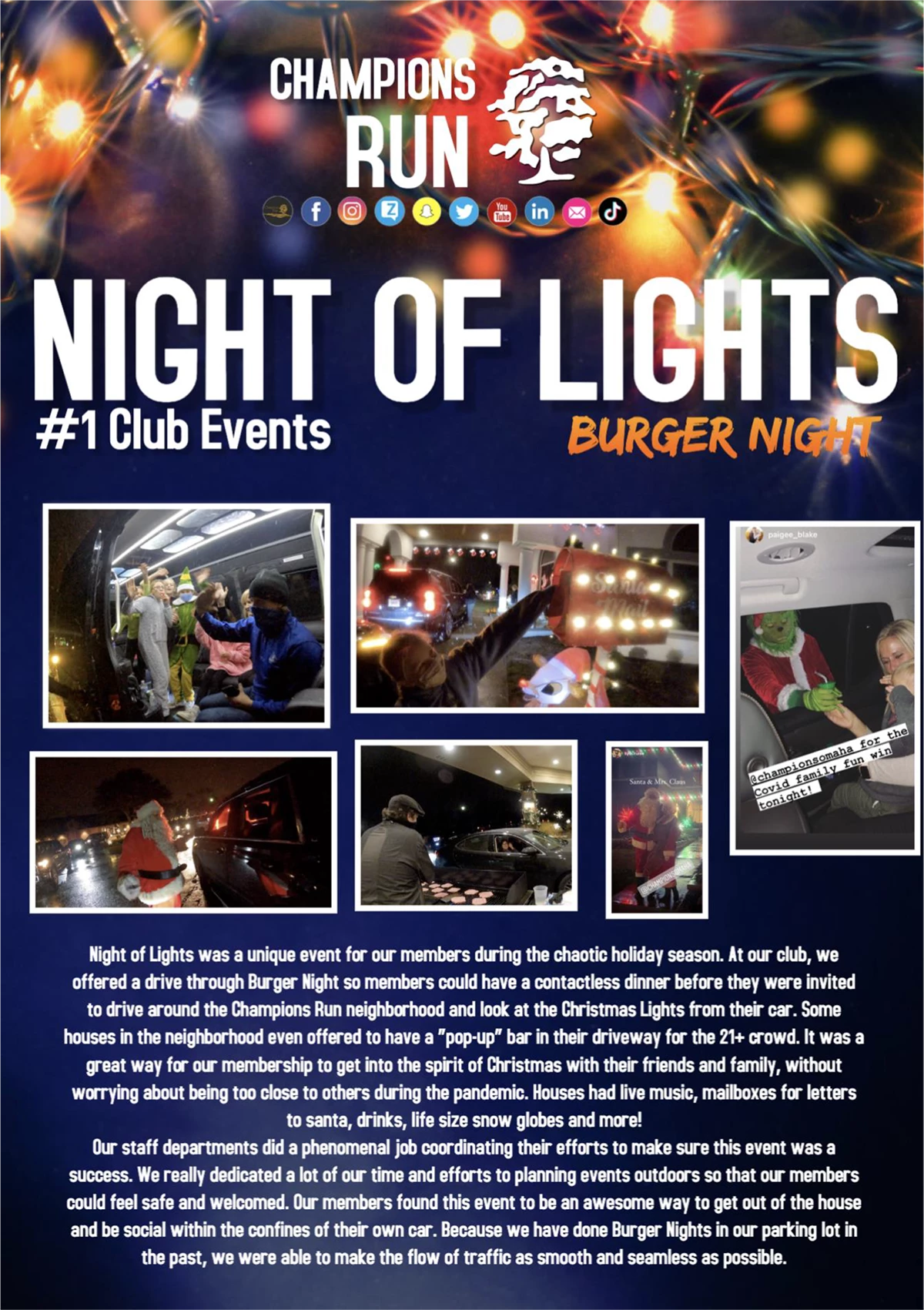 Night of Lights was a unique event for our members during the chaotic holiday season. At our club, we offered a drive through Burger Night so members could have a contactless dinner before they were invited to drive around the Champions Run neighborhood and look at the Christmas Lights from their car. Some houses in the neighborhood even offered to have a “pop-up” bar in their driveway for the 21+ crowd. It was a great way for our membership to get into the spirit of Christmas with their friends and family, without worrying about being too close to others during the pandemic.