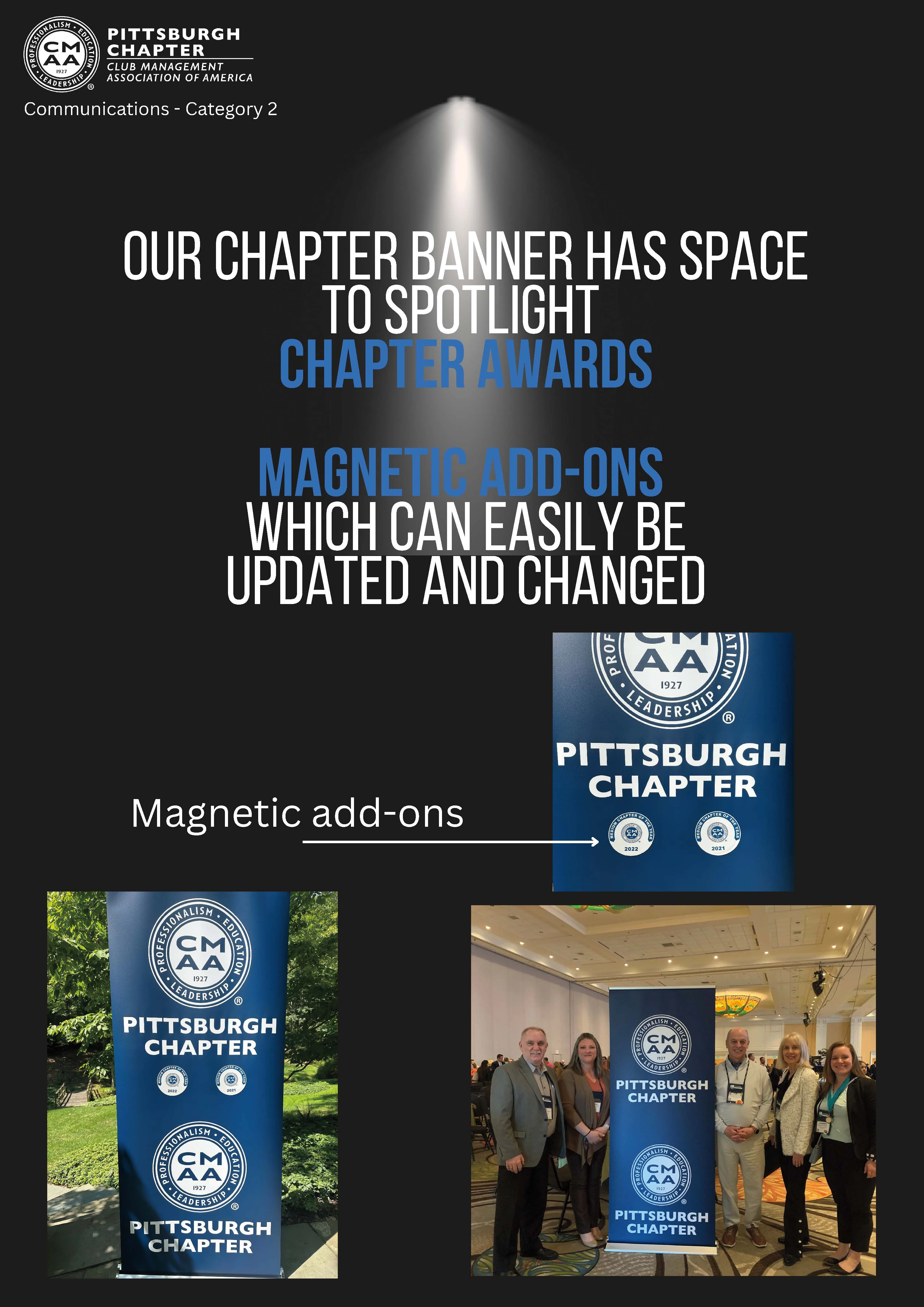 A local printing company helped us to create these magnetic add-ons which can be changed and updated and added to. Since awards are given out a world conference, which not all chapter members attend it helps promote the chapter achievements. The banner and awards are also is on display for our sponsors to see the chapter is keeping current.