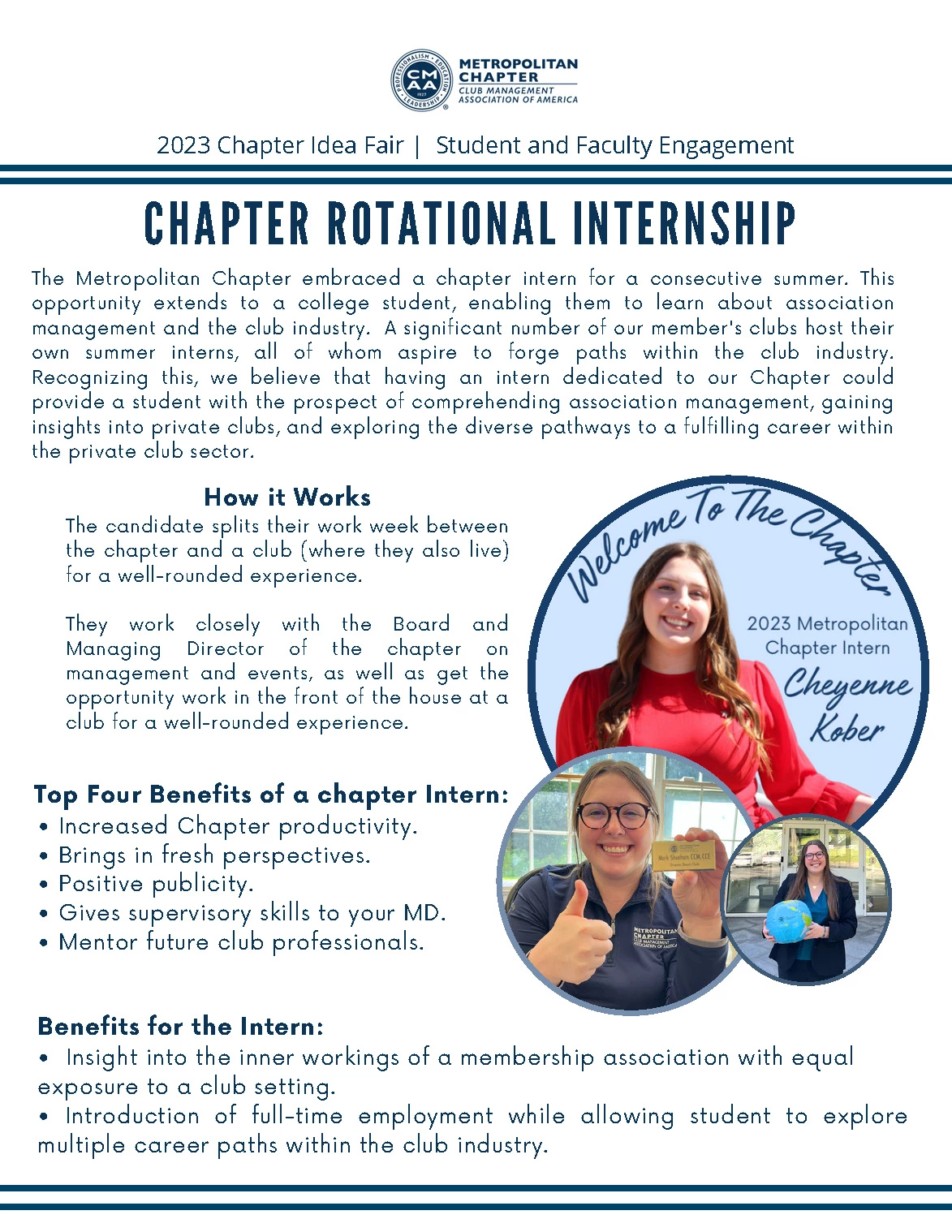 The Chapter employs an intern in the summer that works closely with the Board and Managing Director on management and events. The intern also works and lives at a club gaining front of the house exposure for a well-rounded experience.