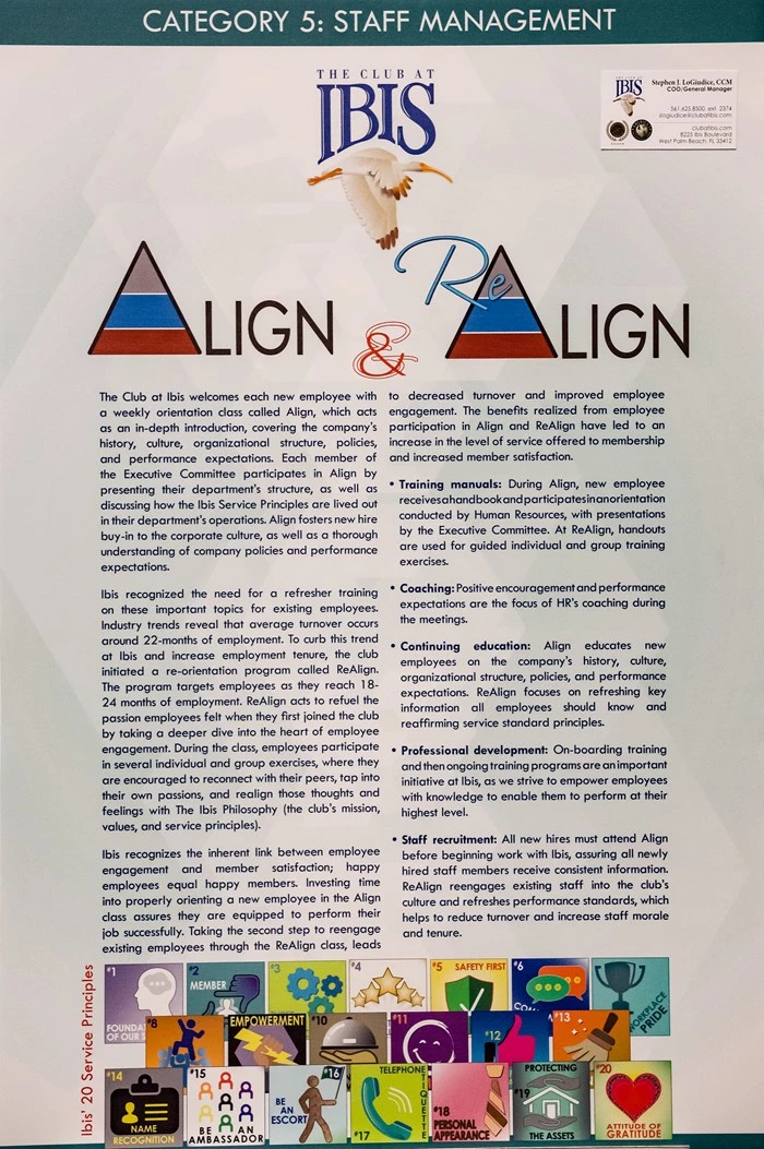 Staff recruitment: All new hires must attend Align before beginning work with Ibis, assuring all newly hired staff members receive consistent information. ReAlign reengages existing staff into the club’s culture and refreshes performance standards, which helps to reduce turnover and increase staff morale and tenure.