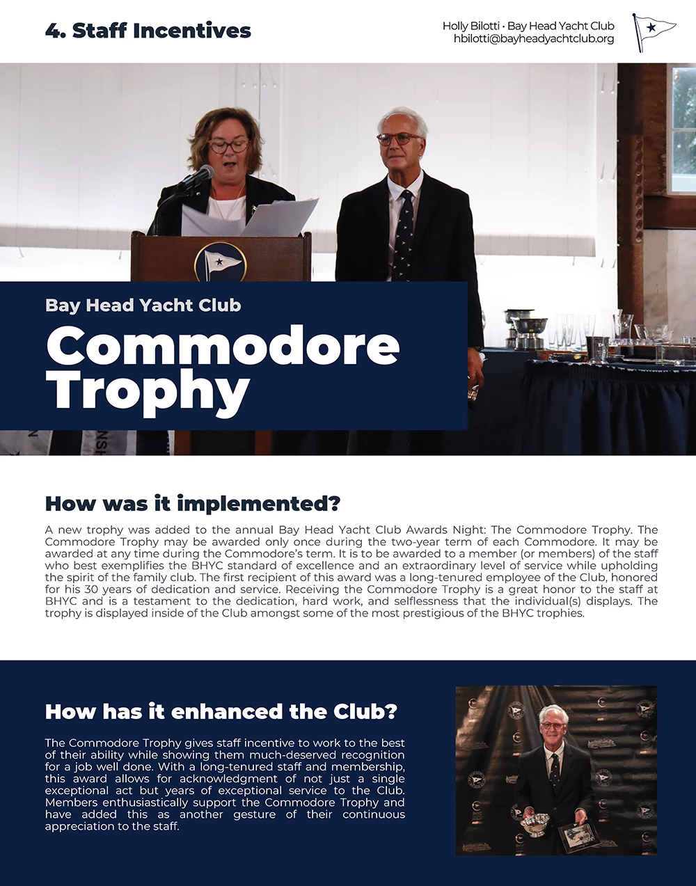 The Commodore Trophy gives staff incentive to work to the best of their ability while showing them much-deserved recognition for a job well done. With a long-tenured staff and membership, this award allows for acknowledgment of not just a single exceptional act but years of exceptional service to the Club. Members enthusiastically support the Commodore Trophy and have added this as another gesture of their continuous appreciation to the staff.