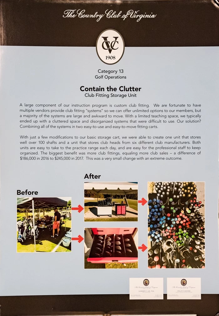 In 2017, our golf club sales were approximately $245,000 with the vast majority of those clubs being custom fit. This simple change to our storing and organization of the fitting carts allowed the professional staff to quickly and accurately find the proper club type for each person. We were able to focus more on the person instead of looking for a misplaced item creating a better overall experience. We were also better able to secure the club components while making transportation easier on the staff. A simple solution that made a huge impact.