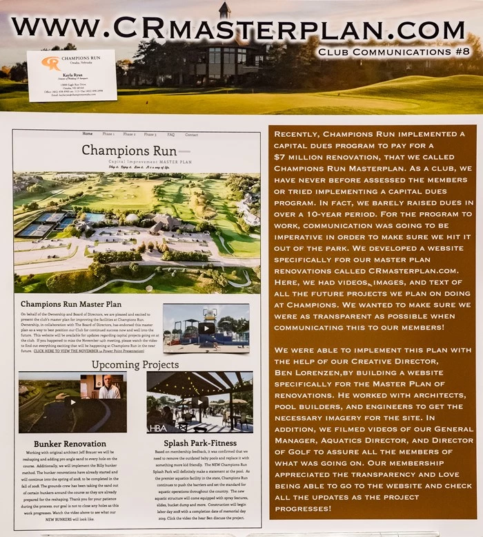 Recently, Champions Run implemented a capital dues program to pay for a $7 million renovation, that we called Champions Run Masterplan. As a club, we have never before assessed the members or tried implementing a capital dues program. In fact, we barely raised dues in over a 10-year period. For the program to work, communication was going to be imperative in order to make sure we hit it out of the park. We developed a website specifically for our master plan renovations called CRmasterplan.com. Here, we had videos, images, and text of all the future projects we plan on doing at Champions. We wanted to make sure we were as transparent as possible when communicating this to our members!