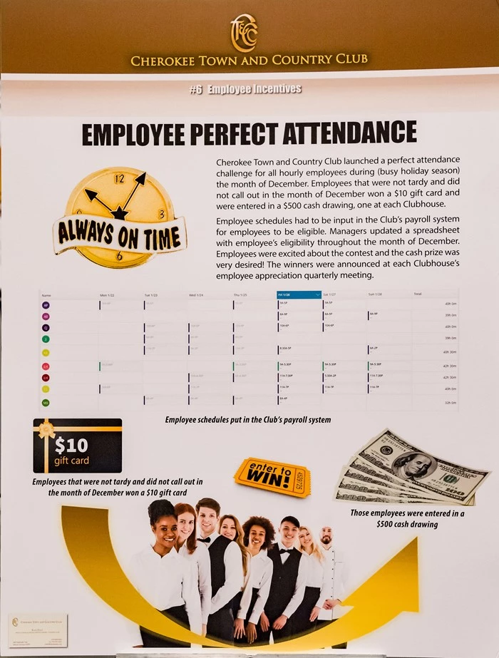 Cherokee Town and Country Club launched a perfect attendance challenge for all hourly employees in the month of December. Employees that were not tardy and did not call out in the month of December won a $10 gift card and were entered in a $500 cash drawing, one at each Clubhouse.