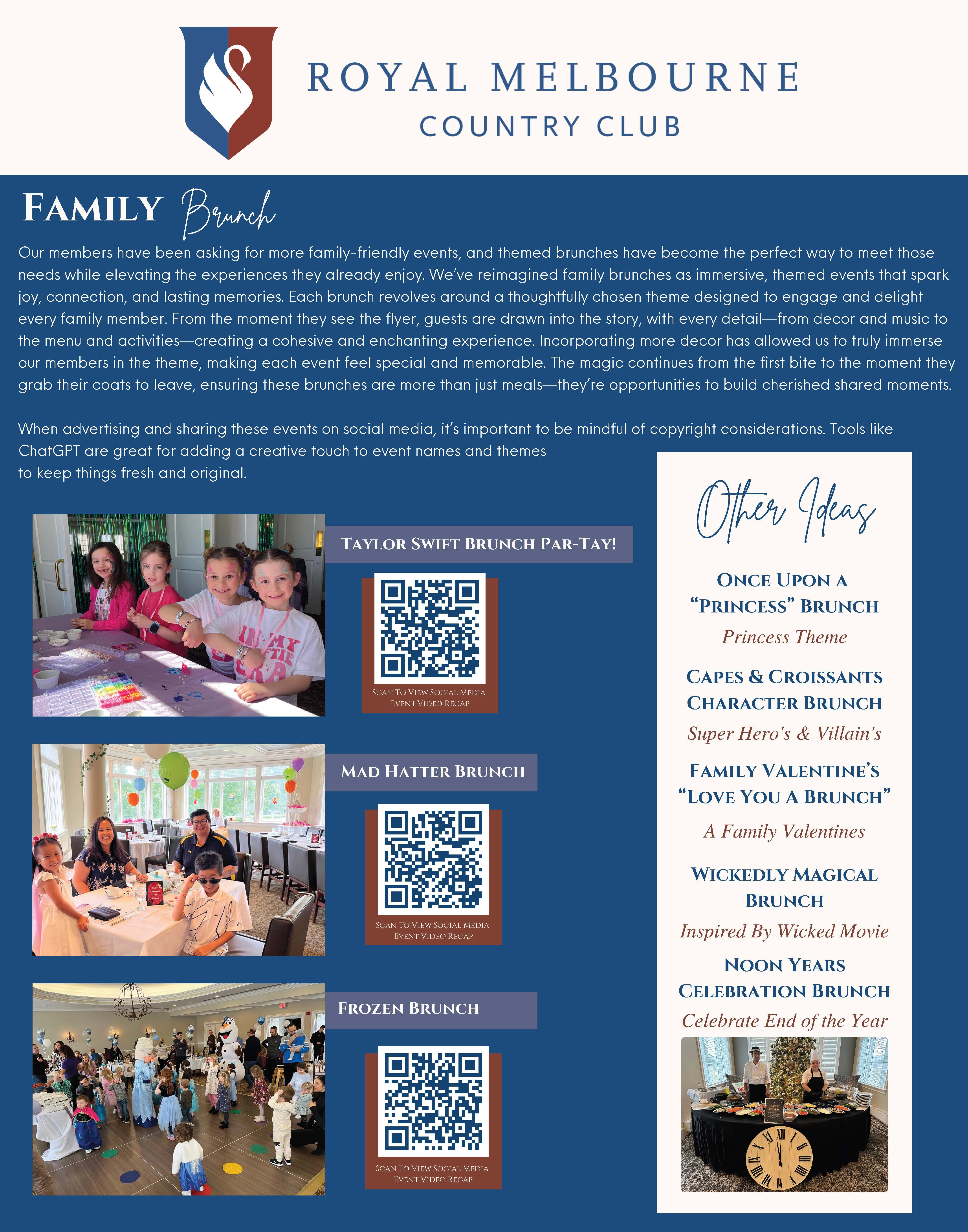 At Royal Melbourne we are committed to doing one themed brunch each quarter aside from our traditional "Santa Brunch" or "Easter Brunch." Members really enjoy having more family events available to them. They also appreciate the immersive feeling we are giving them.