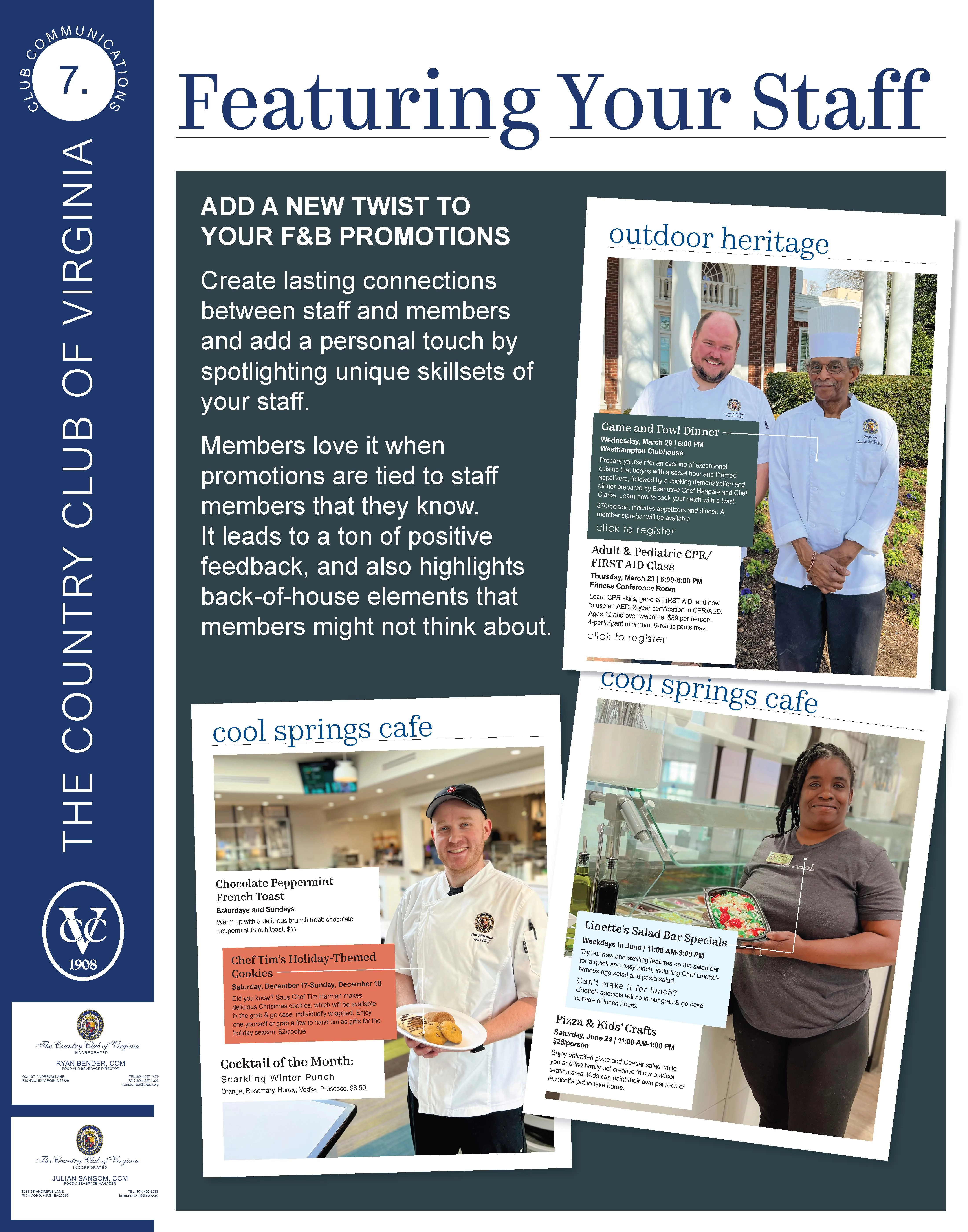At the Club, we understand the importance of showcasing our talented and dedicated staff in our promotional efforts and communications. We believe that our team members are the heart and soul of the Club, and their passion and expertise deserve recognition. To implement featuring our staff in our promotions, we have initiated a strategy that includes regular employee spotlights in our monthly newsletter and our weekly email blasts. These spotlights highlight the unique skills of our staff giving our members a glimpse at the passion they have for delivering exceptional offerings and service.