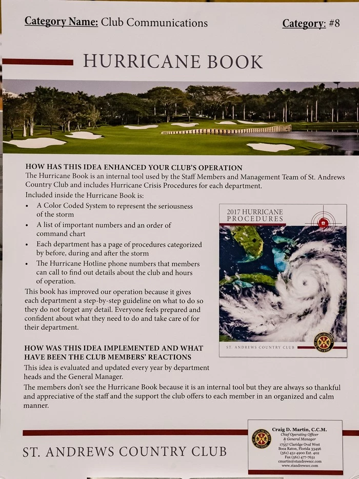 The Hurricane Book is an internal tool used by the Staff Members and Management Team of St. Andrews Country Club and includes Hurricane Crisis Procedures for each department.