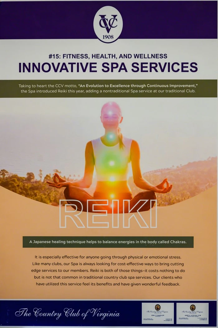 Taking to heart the CCV motto, An Evolution to Excellence through Continuous Improvement, the spa introduced Reiki this year. Reiki is a Japanese healing technique that helps to balance energies in the body called Chakras. It is especially effective for anyone going through physical or emotional stress. The CCV spa is always looking for cost effective ways to bring cutting edge services to our members. Reiki is both of those things. It costs nothing to do but is not that common in traditional country club spa services. Our clients who have utilized this service feel its benefits and have given wonderful feedback!