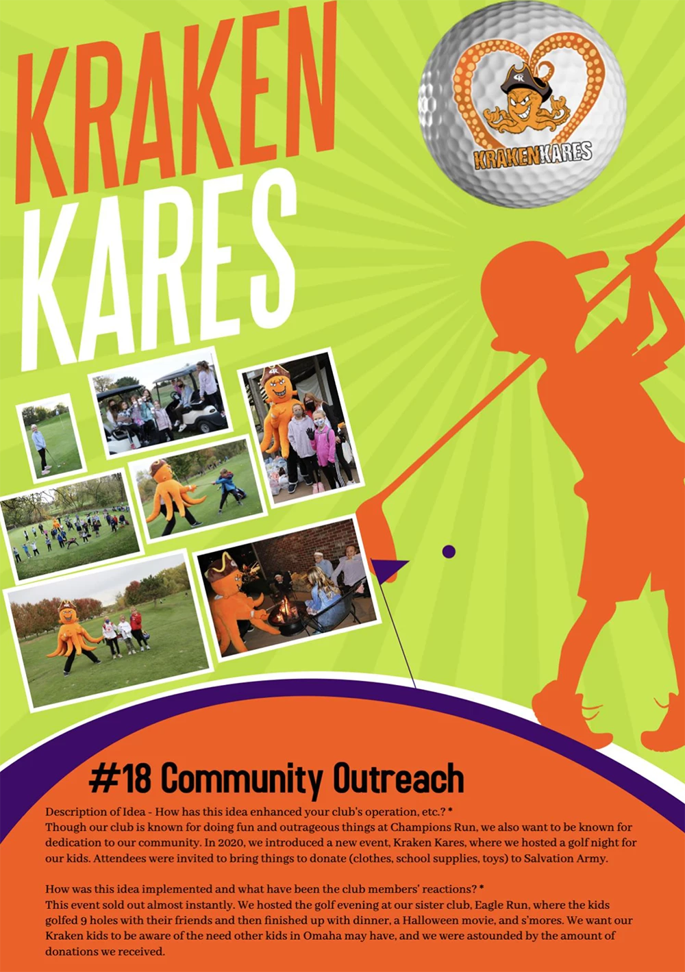 This event sold out almost instantly. We hosted the golf evening at our sister club, Eagle Run, where the kids golfed 9 holes with their friends and then finished up with dinner, a Halloween movie, and s’mores. We want our Kraken kids to be aware of the need other kids in Omaha may have, and we were astounded by the amount of donations we received.