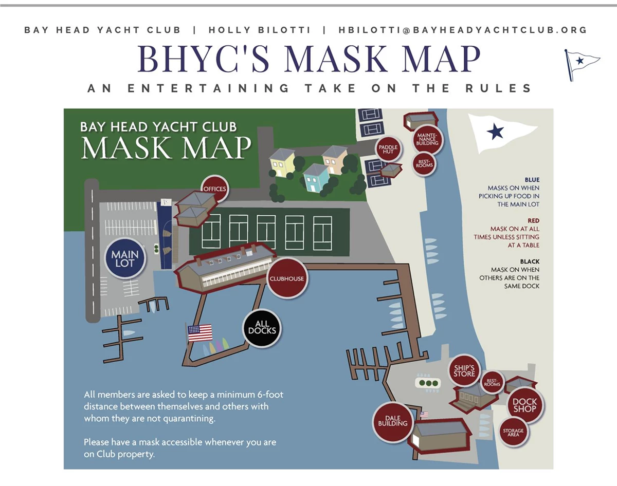 To ensure the safety of members and staff at BHYC during the pandemic, the Club designed an appealing, informational sign that is easy to comprehend and clearly defines mask-wearing parameters around BHYC property. The Mask Map gives members clear direction while providing BHYC staff with an appealing way to enforce the mask wearing rule.