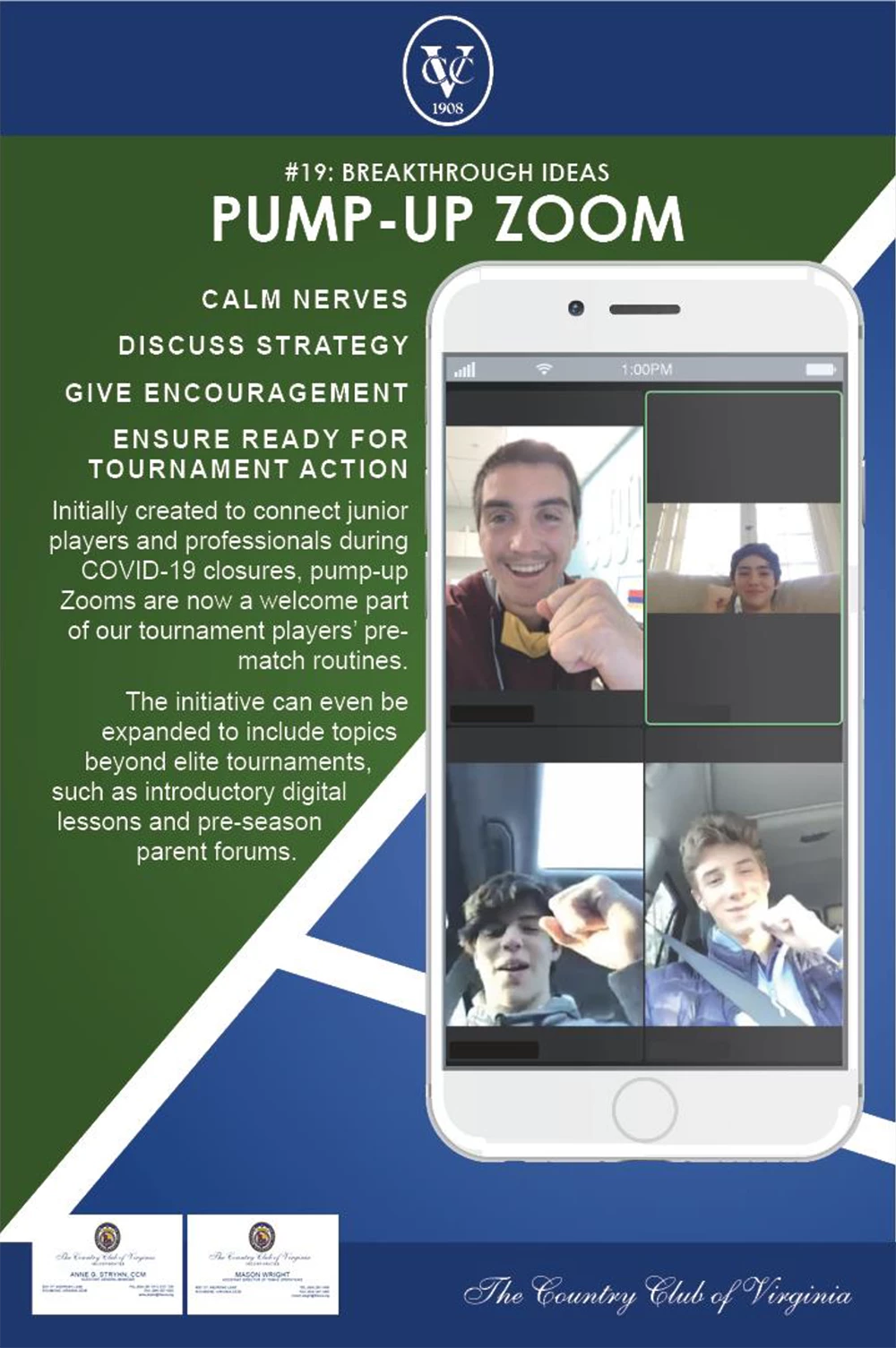 Initially created to connect junior players and professionals during COVID-19 closures, pump-up Zooms are now a welcome part of our tournament players’ pre-match routines. The pump-up Zooms allow Racquet Sports professionals to calm nerves, discuss strategy, give encouragement, and ensure juniors are ready for tournament action.