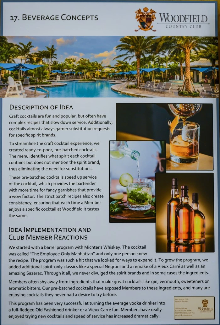 These pre-batched cocktails speed up service of the cocktail, which provides the bartender with more time for fancy garnishes that provide a wow factor. The strict batch recipes also create consistency, ensuring that each time a Member enjoys a specific cocktail at Woodfield it tastes the same.