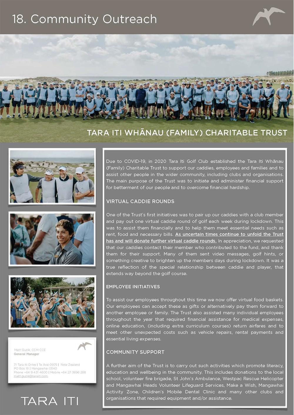 Due to COVID-19, in 2020 Tara Iti Golf Club established the Tara Iti Whānau (Family) Charitable Trust to support it’s caddies, employees and families and to assist other people in the wider community, including clubs and many non-for-profit organisations. The main purpose of the Trust was to initiate and administer financial support for the betterment of our people and to overcome financial hardship.