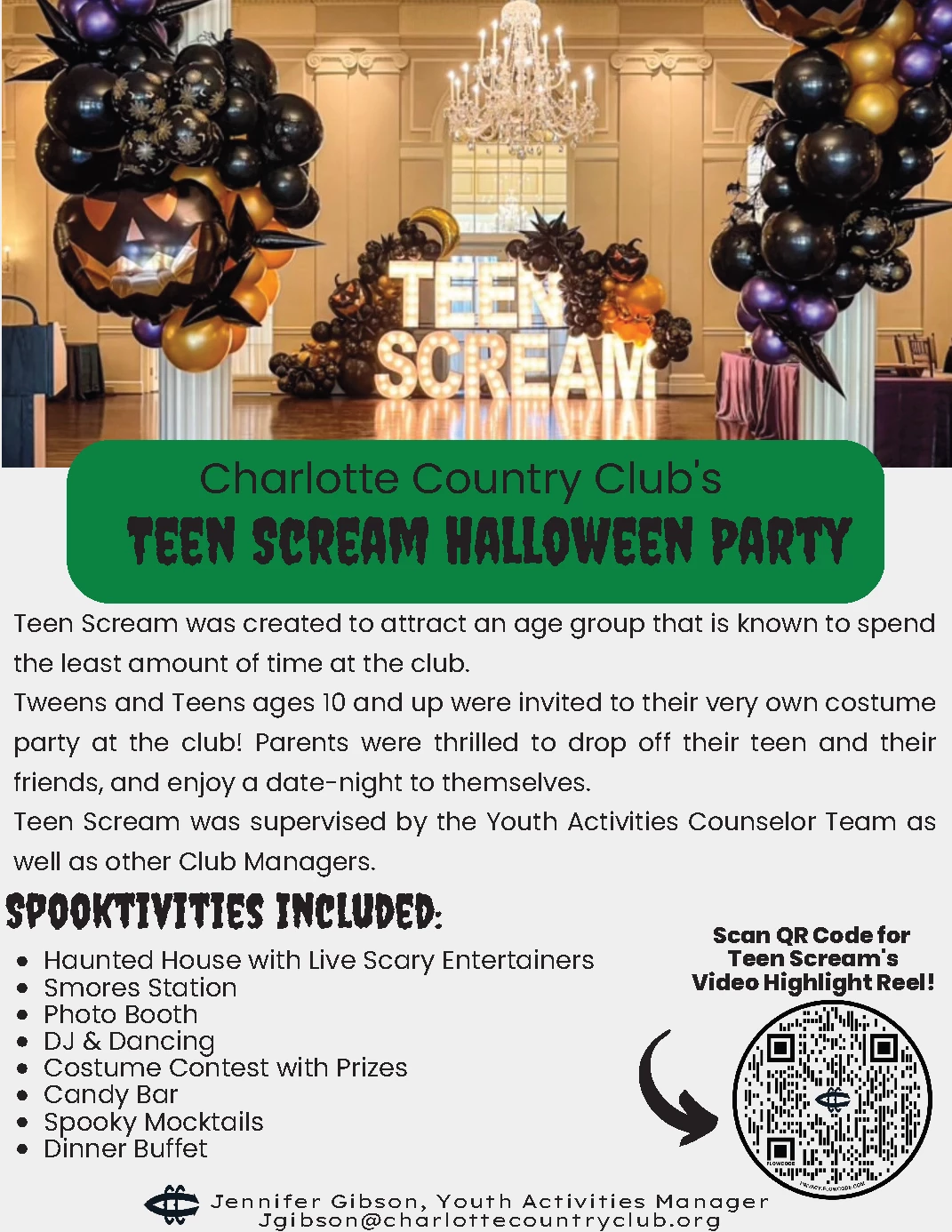 Teen Scream was implemented to create some excitement for the Teen/Tween age group at Charlotte Country Club, as this group has the least amount of engagement at the club. The Teen Scream Halloween Party created a safe space for teens to be themselves and show off their club to their personal friends.