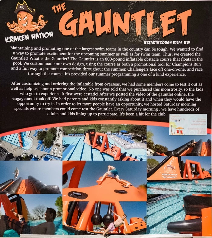 Maintaining and promoting one of the largest swim teams in the country can be tough. We wanted to find a way to promote excitement for the upcoming summer as well as for swim team. Thus, we created the Gauntlet! What is the Gauntlet? The Gauntlet is an 800-pound inflatable obstacle course that floats in the pool. We custom made our own design, using the course as both a promotional tool for Champions Run and a fun way to promote competition throughout the summer. Challengers face off one-on-one, and race through the course. It’s provided our summer programming a one of a kind experience.