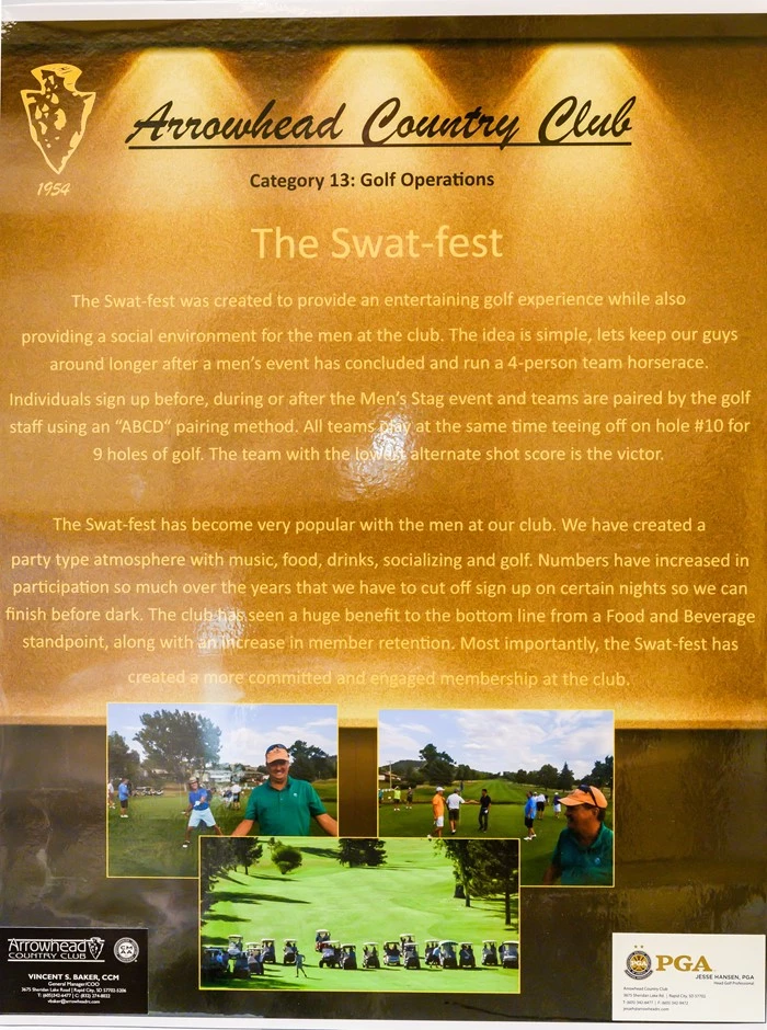 The idea of the Swat-fest was conceptualized as a way for our men to play more golf, provide them a fun member experience and to get our members meeting other people beyond their current social circle. Arrowhead has had an issue of tight social circles making it hard for younger or new members to meet new friends and justify belonging to the club. Instead of a regular mixed men's 18-hole event we decided that by offering a horse-race type competition with a party like atmosphere after a men's day shotgun we could get good participation and with the golf staff making the teams of 4 we could mix up players and give guys an opportunity to meet new golfing partners and expand their social circles. Needless to say the men of the club jumped on this right away and love the horse-race experience of having 30-40 guys all playing at the same time and having fun. We are finding that our men are meeting other golfing partners, they are playing more golf because of it, but most importantly we see that their wife's and children are making more friends which has helped our member retention significantly. We are seeing more use of the pool as couples and family's make new acquaintances, and we are also seeing more women and juniors playing golf as they have developed more golfing groups as well. Our Food & Beverage operation has seen an uptick with the Beverage Cart being out for every Swat-fest as well as the pub and dinning areas on those nights with the wife's meeting their husbands and new friends for dinner and drinks after.