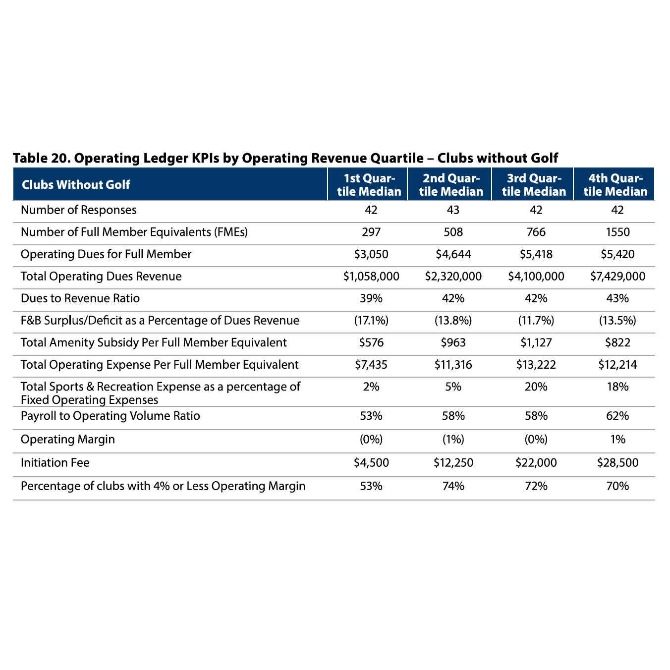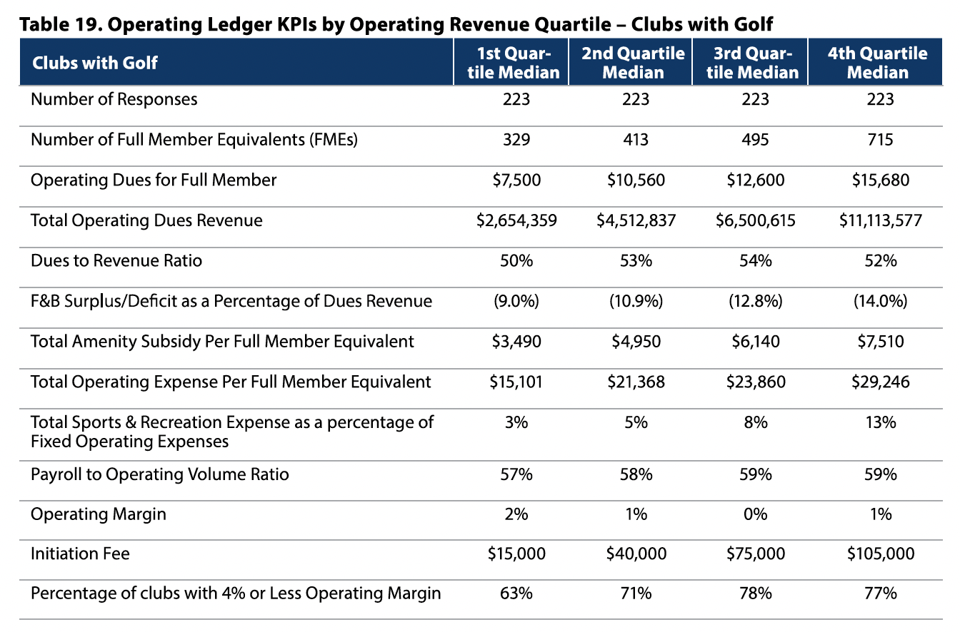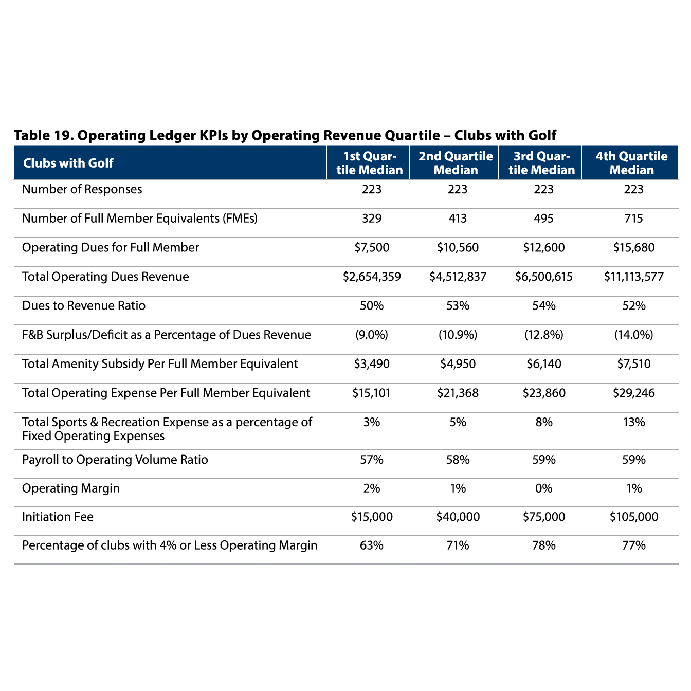Tables 19 and 20 present a comprehensive view of operating ledger KPIs segmented by operating quartiles for clubs with golf and clubs without golf, respectively. Despite differences in club type and size, the patterns across both tables are strikingly similar.
