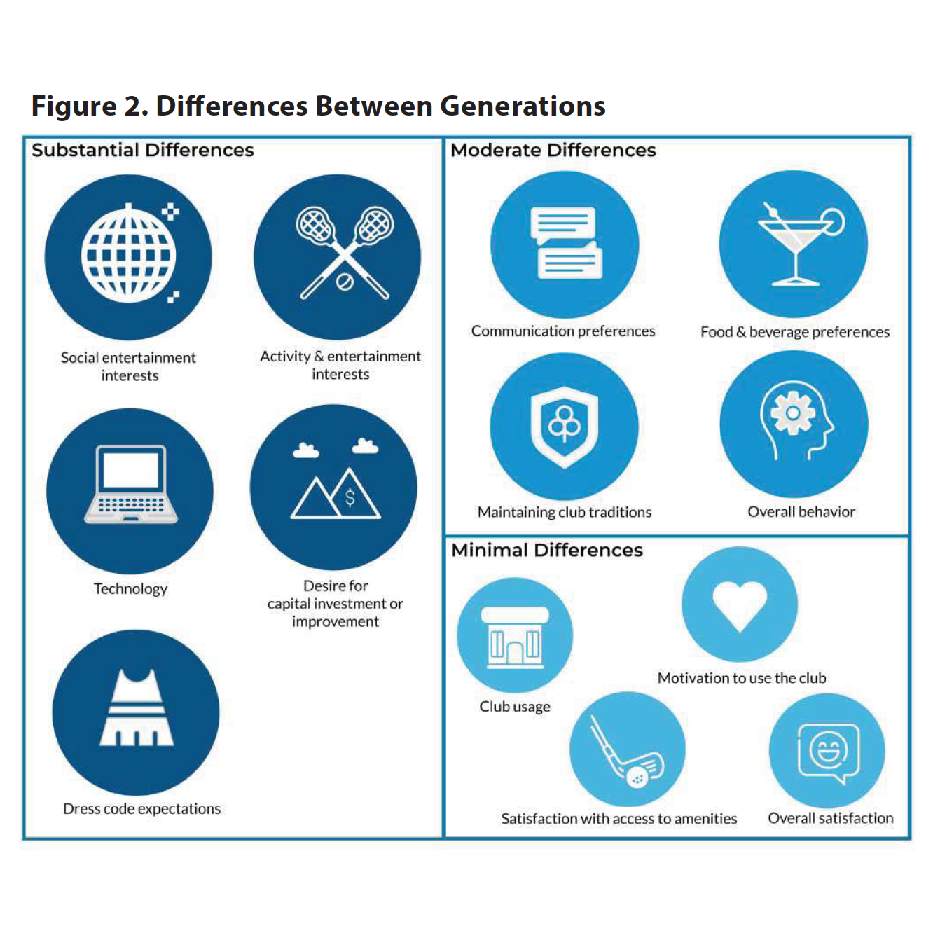 Moderate Differences. These areas indicate a moderate difference between generations as clubs may find targeted overlap regarding communication, food and beverage preferences, club traditions, and overall behavior. Identifying common ground (and differences) through member surveys among these areas helps identify strategies and actions that effectively balance generational needs and preferences while enabling the club to tailor appropriate tactics.