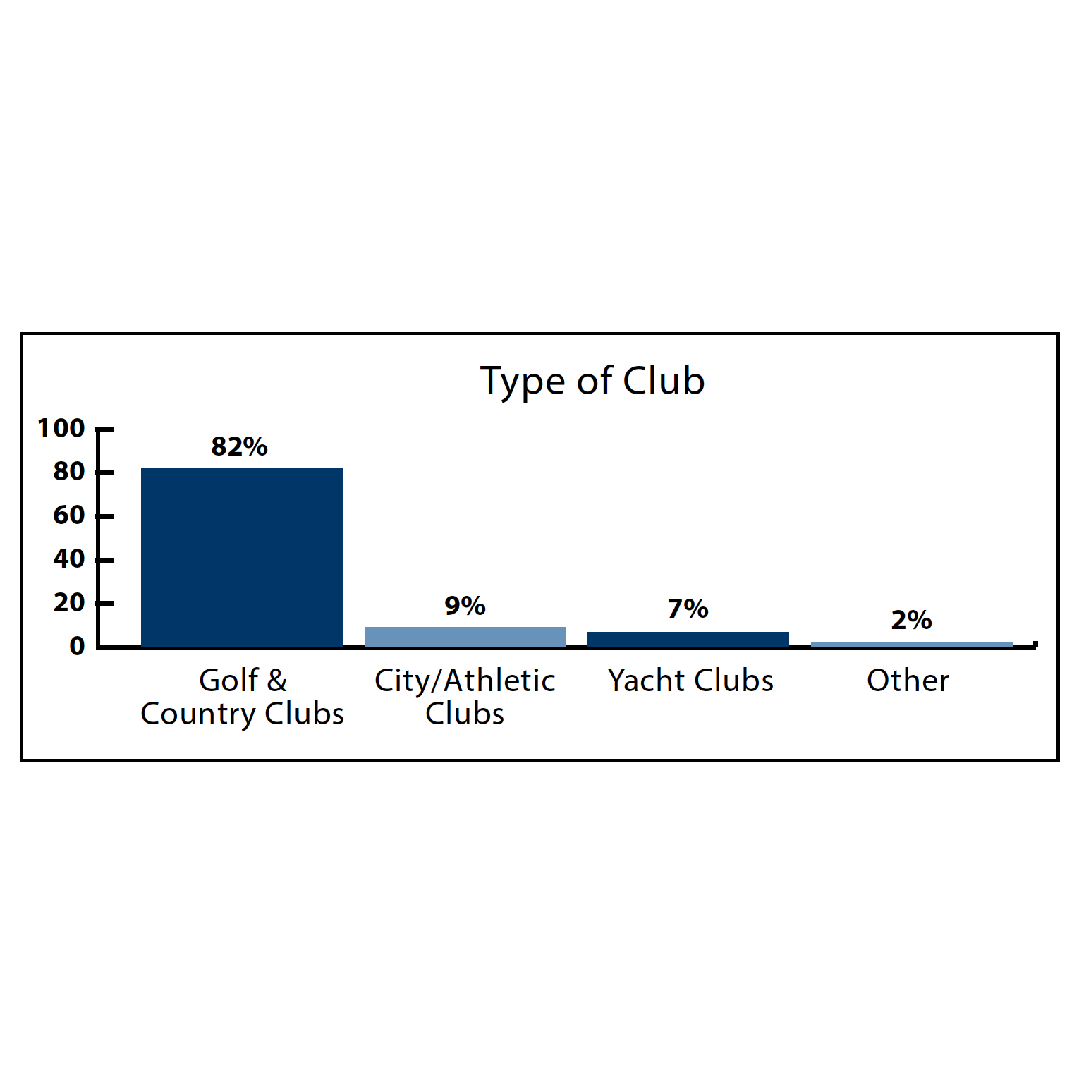 There are approximately 5,659 private clubs in the country. These clubs include Golf Clubs, Country Clubs (clubs that have golf courses and an array of non-golf sports and amenities), City/Athletic Clubs (including dining-only clubs), Yacht Clubs, and Tennis/Racquet Clubs. This research report focuses on the 3,887 identifiable clubs in the US that have revenues exceeding $1 million.