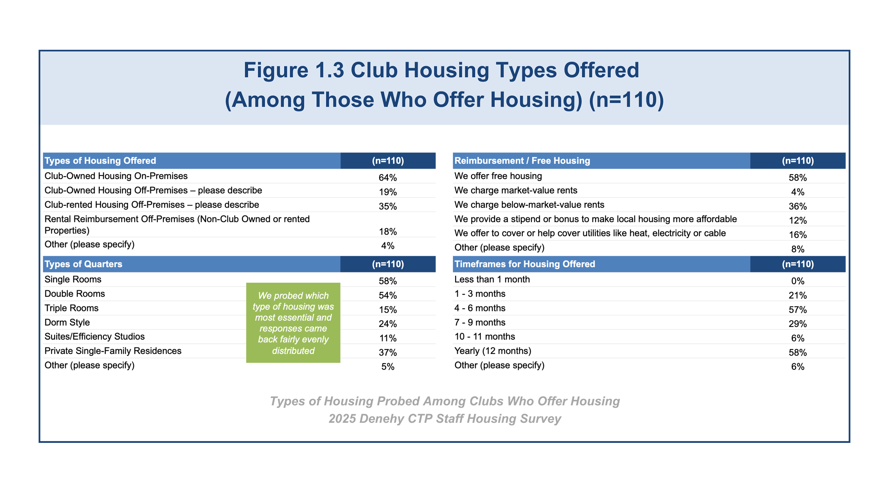 - Seasonal housing is prevalent, though some clubs extend year-round housing to retain valuable staff. In essence, they rent or buy year-round housing and use it as staffing demands.
