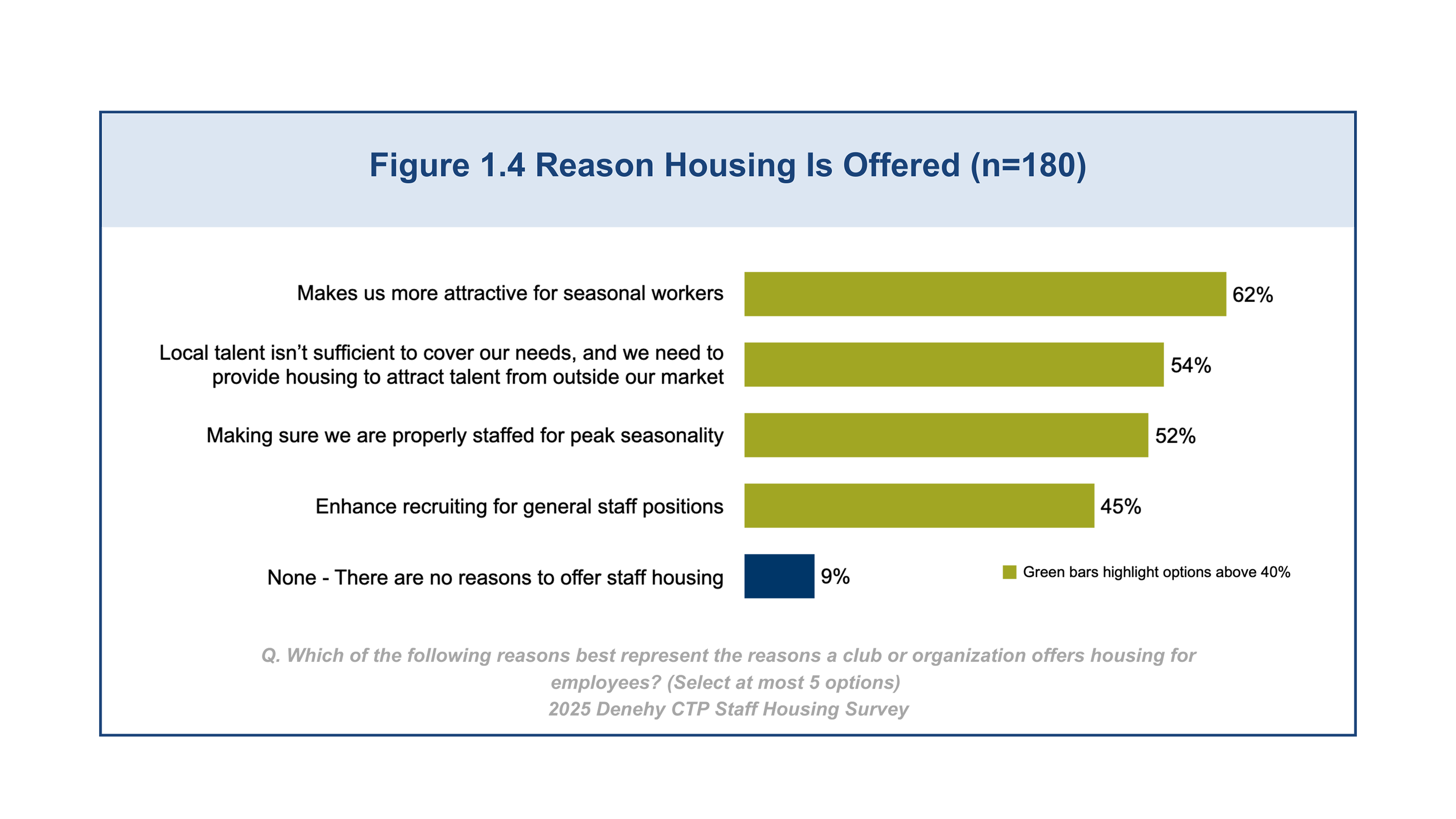 Club managers largely agree that staff housing enhances their ability to attract and retain employees. Key advantages include: