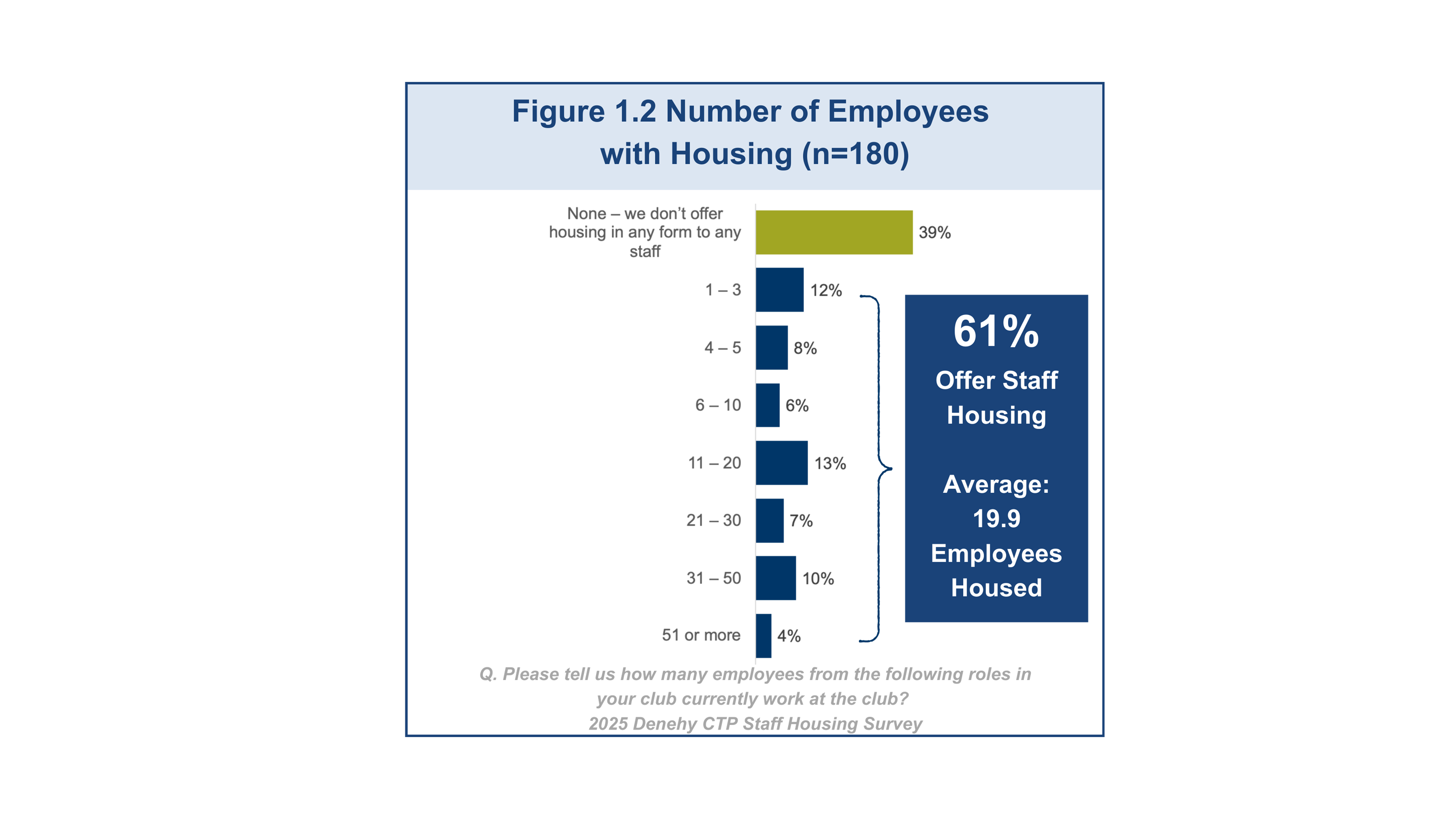 Sixty-one percent of clubs surveyed currently offer staff housing, accommodating an average of 20 employees per club. Among those offering housing: