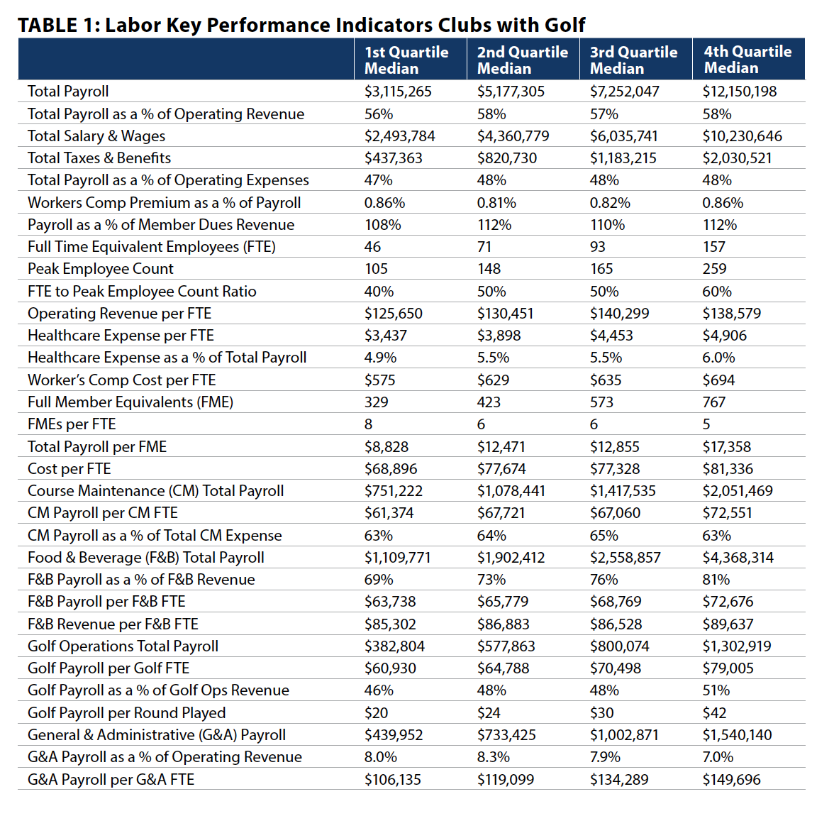 In reviewing the Labor Key Performance Indicators for Clubs with Golf, most of the results are as you would expect. Clubs with higher Operating Revenue do carry higher payrolls, but some of the ratios are very interesting and reflect choices made in operations. Total Payroll as a percentage of Operating Revenue, Operating Expenses, and Dues Revenue were relatively consistent across all four quartiles. The ratios that were not consistent were the Full Time Equivalent Employee to Peak Employee Count Ratio, the Food and Beverage Payroll as a Percentage of Food and Beverage Revenue, and Golf Payroll per Round Played.