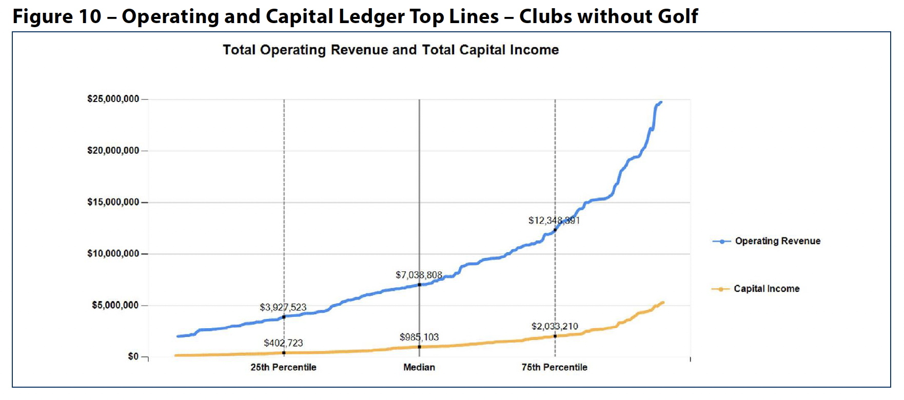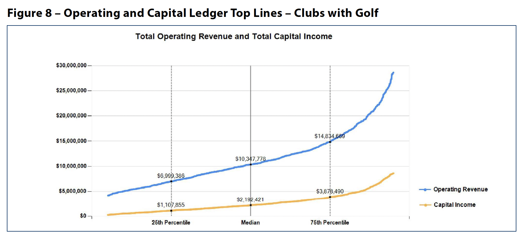 Figure 8 presents the top-line financial data, Operating Revenue and Capital Income, for clubs with golf, while Figure 10 provides the same overview for clubs without golf. These figures offer a high-level view of the financial structure across club types.
