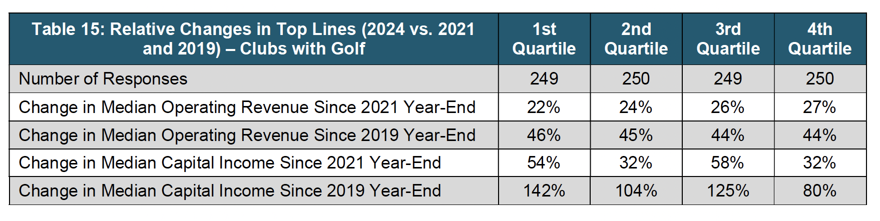 - This earlier growth among smaller clubs was largely driven by external market forces during the pandemic (e.g., increased demand for golf), rather than strategic planning or investment. Now, with an additional year of data (2023–2024), larger clubs are showing stronger capital income growth, fueled by intentional increases in capital dues and other funding channels.