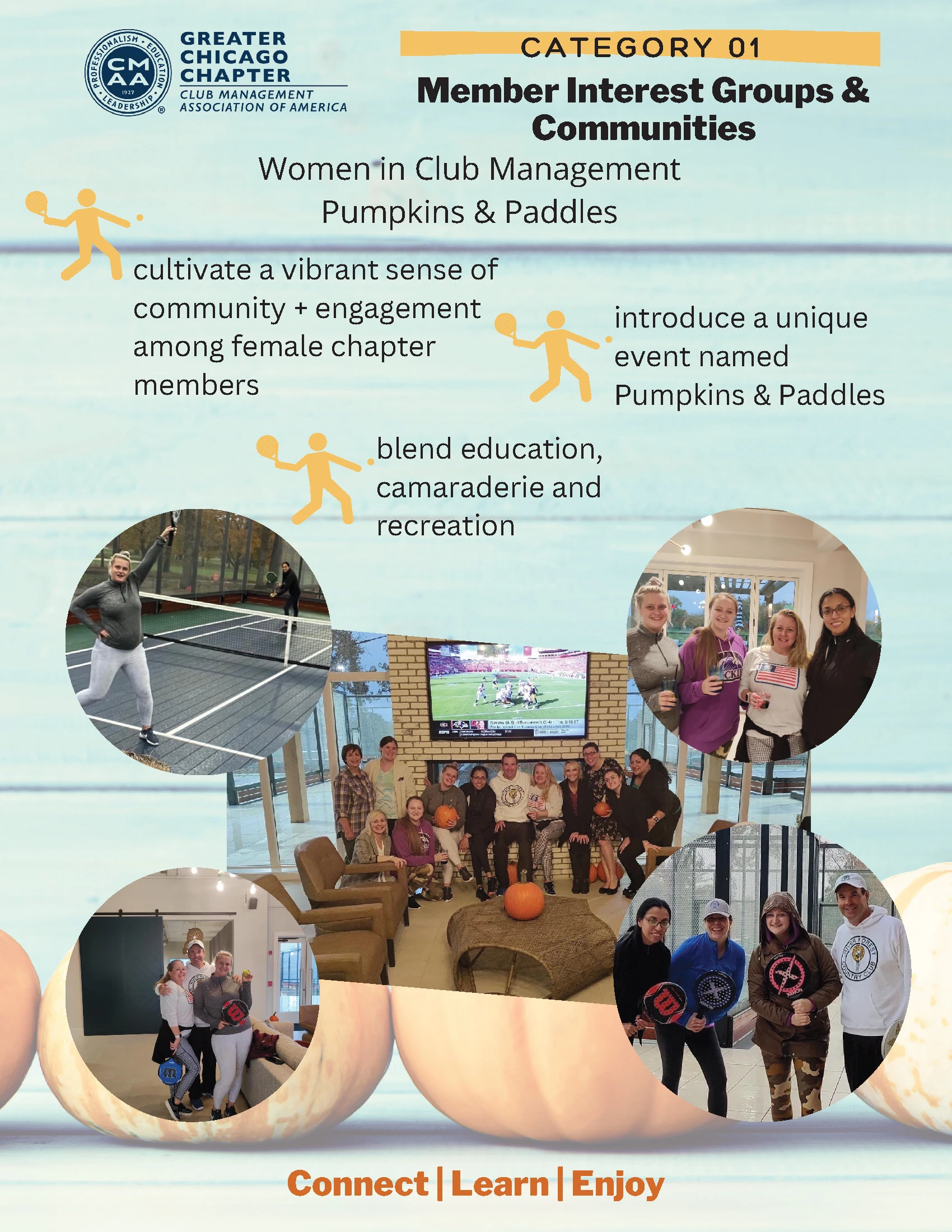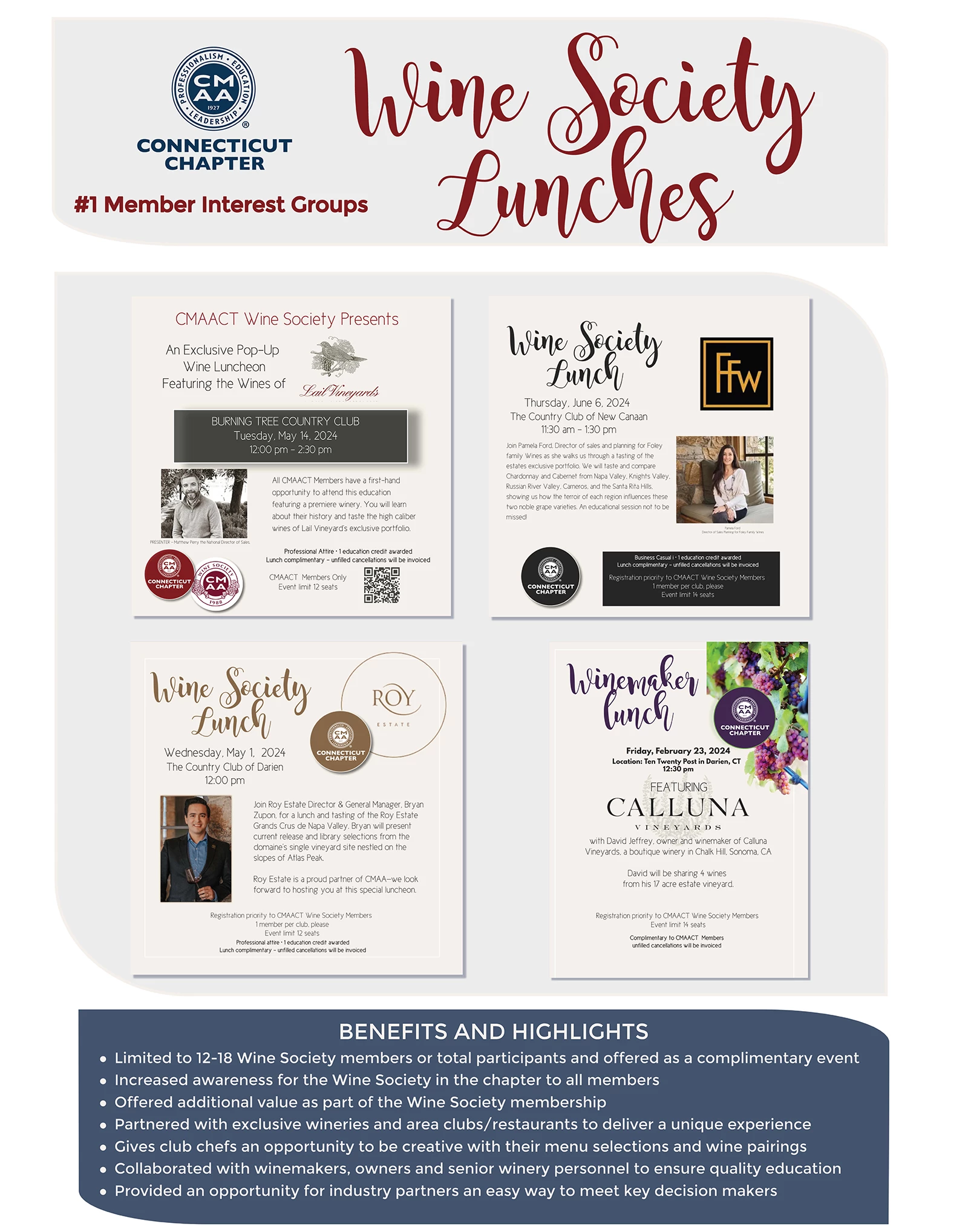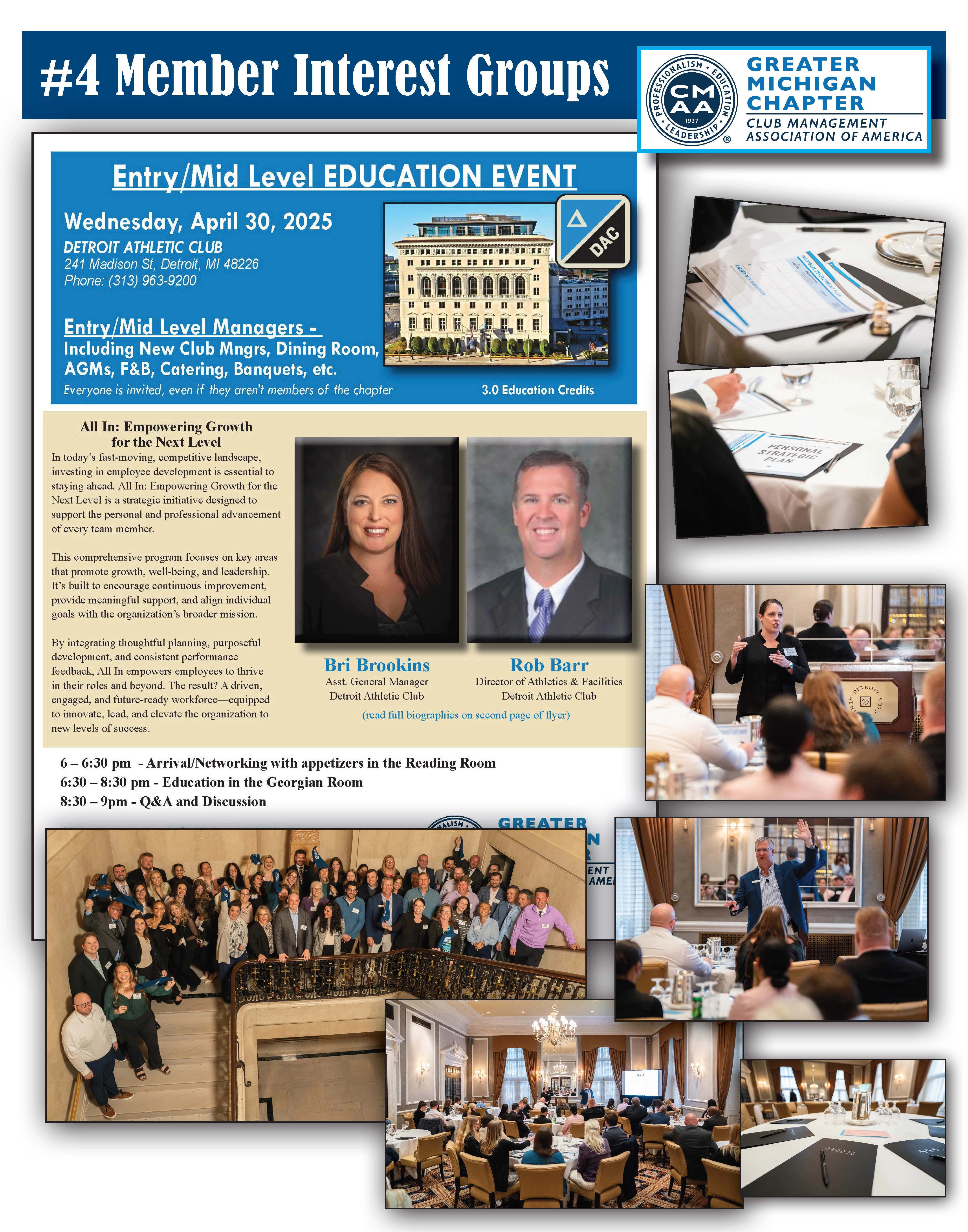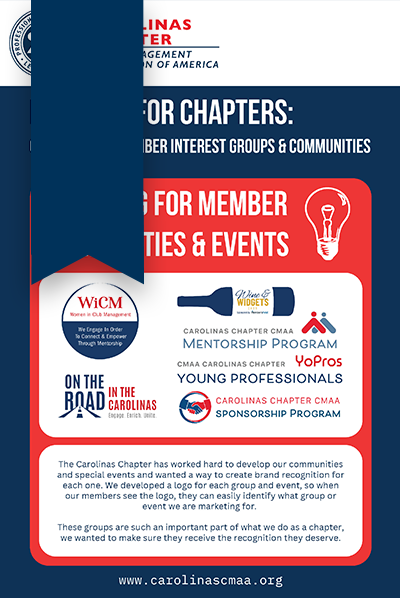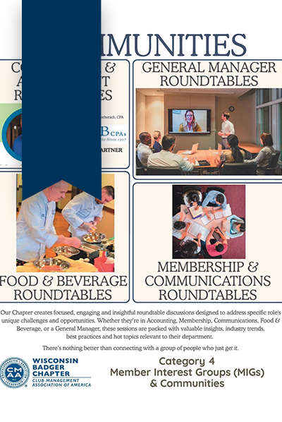 Chapter support/alignment of and/or events for CMAA’s Member Interest Groups (MIGs, formerly called Special Interest Groups or SIGs) (i.e., International Wine Society, Women in Club Management, Young Professionals, Yacht Club Managers, City Club Managers, etc.) and Communities (Chef Community, Club Wellness Community, Communications Community, etc.).