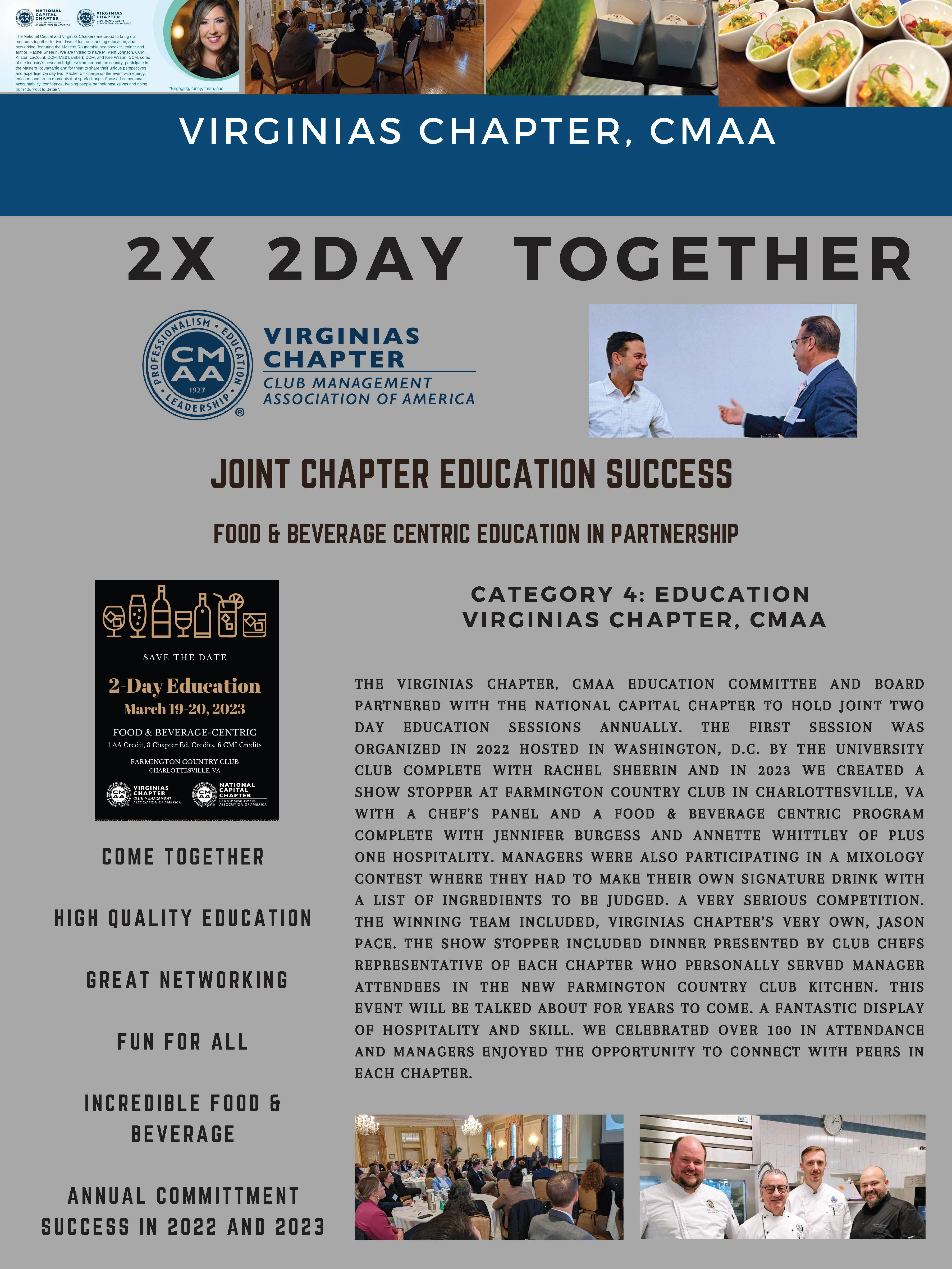 The Virginias Chapter, CMAA Education Committee and Board partnered with the National Capital Chapter to hold joint Two Day Education sessions annually. The first session was organized in 2022 hosted in Washington, D.C. by the University club complete with Rachel Sheerin and in 2023 we created a show stopper at Farmington Country Club in Charlottesville, VA with a chef's panel and a food & Beverage centric program complete with Jennifer Burgess and Annette Whittley of Plus one Hospitality. Managers were also participating in a mixology contest where they had to make their own signature drink with a list of ingredients to be judged. A very serious competition. The Winning Team included, Virginias Chapter's very own, Jason Pace. The show stopper included dinner presented by club chefs representative of each chapter who personally served manager attendees in the new Farmington Country Club Kitchen. This event will be talked about for years to come. A fantastic display of hospitality and skill. We celebrated over 100 in attendance and managers enjoyed the opportunity to connect with peers in each chapter.