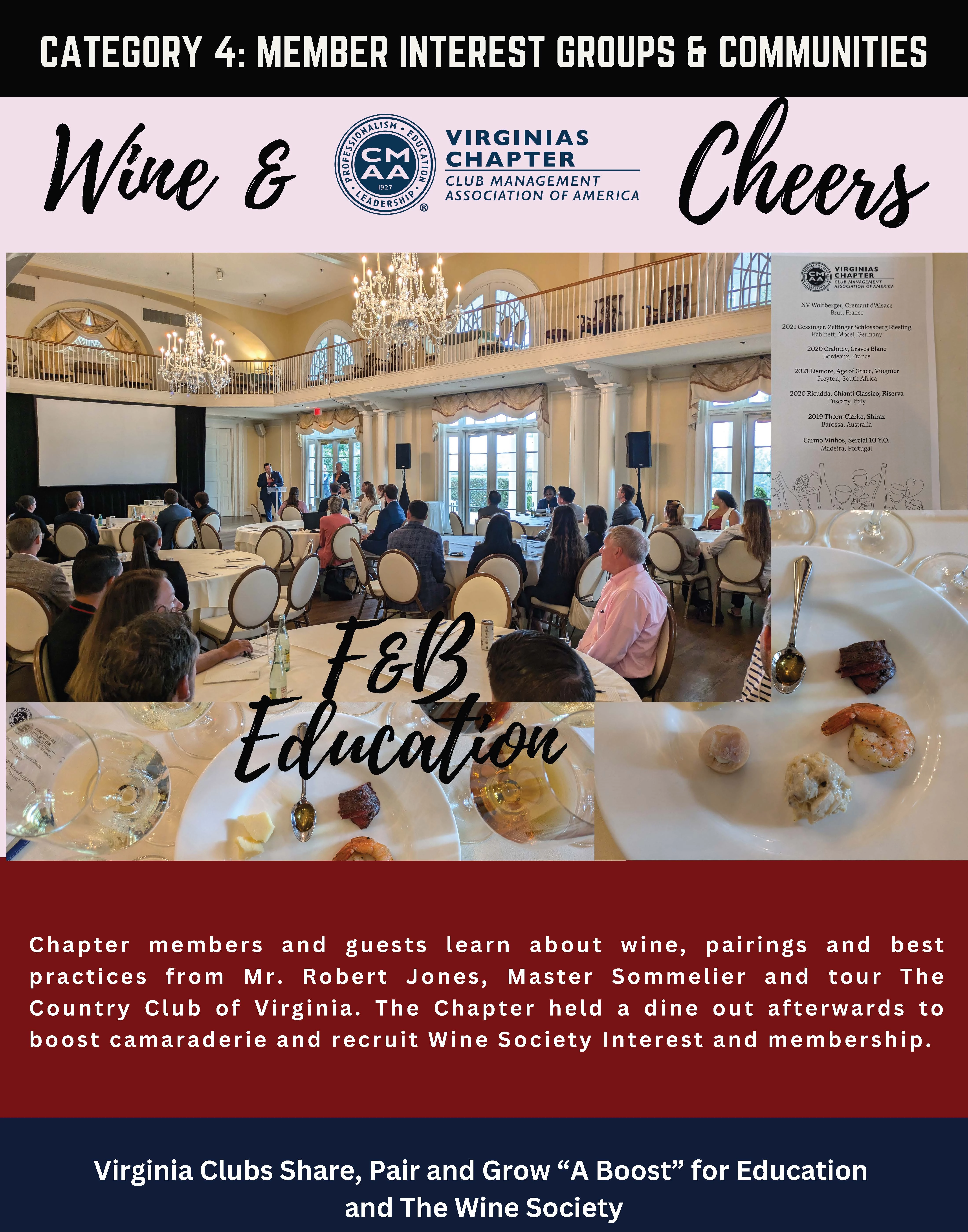 Chapter members and guests learn about wine, pairings and best practices from Mr. Robert Jones, Master Sommelier and tour The Country Club of Virginia. The Chapter held a dine out afterwards to boost camaraderie and recruit Wine Society Interest and membership.