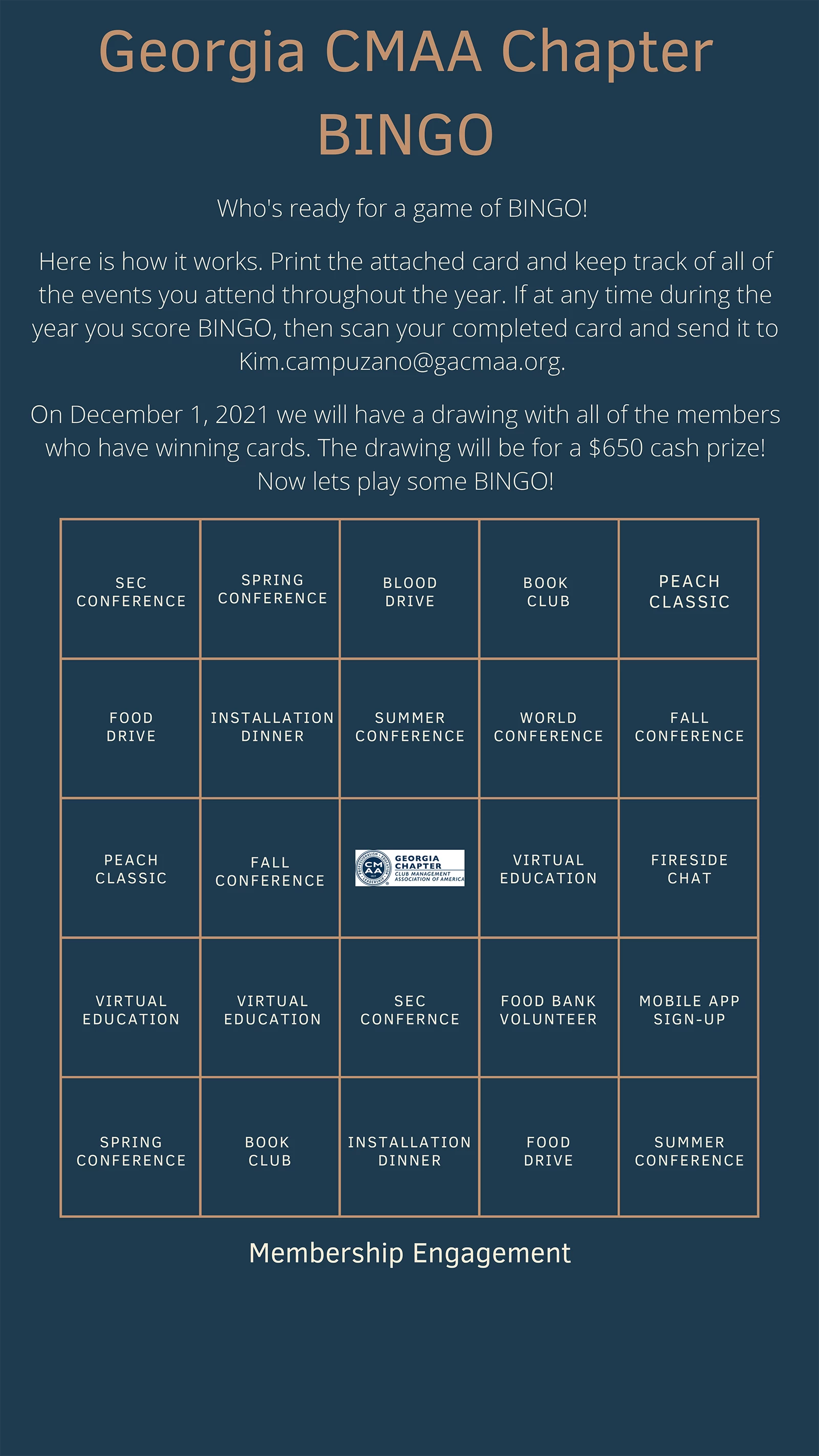 Everyone loves a good game, so why not bring back a classic in order to encourage member participation! That is exactly what we did this year in the Georgia Chapter. We took a spin off the classic game of BINGO and created a board full of our chapter events and community service projects. In order to entice members to participate, we made the prize a cash value equal to that of our annual chapter dues which includes all of our chapter education. We realize most clubs pay for their managers dues, so by making it a cash value, we felt it would get the members vested in the game while at the same time, increasing participation. So far a handful of members have already obtained BINGO and others are in a tight race to fill their BINGO cards. This has created a healthy competition amongst our members, which means we nailed it!