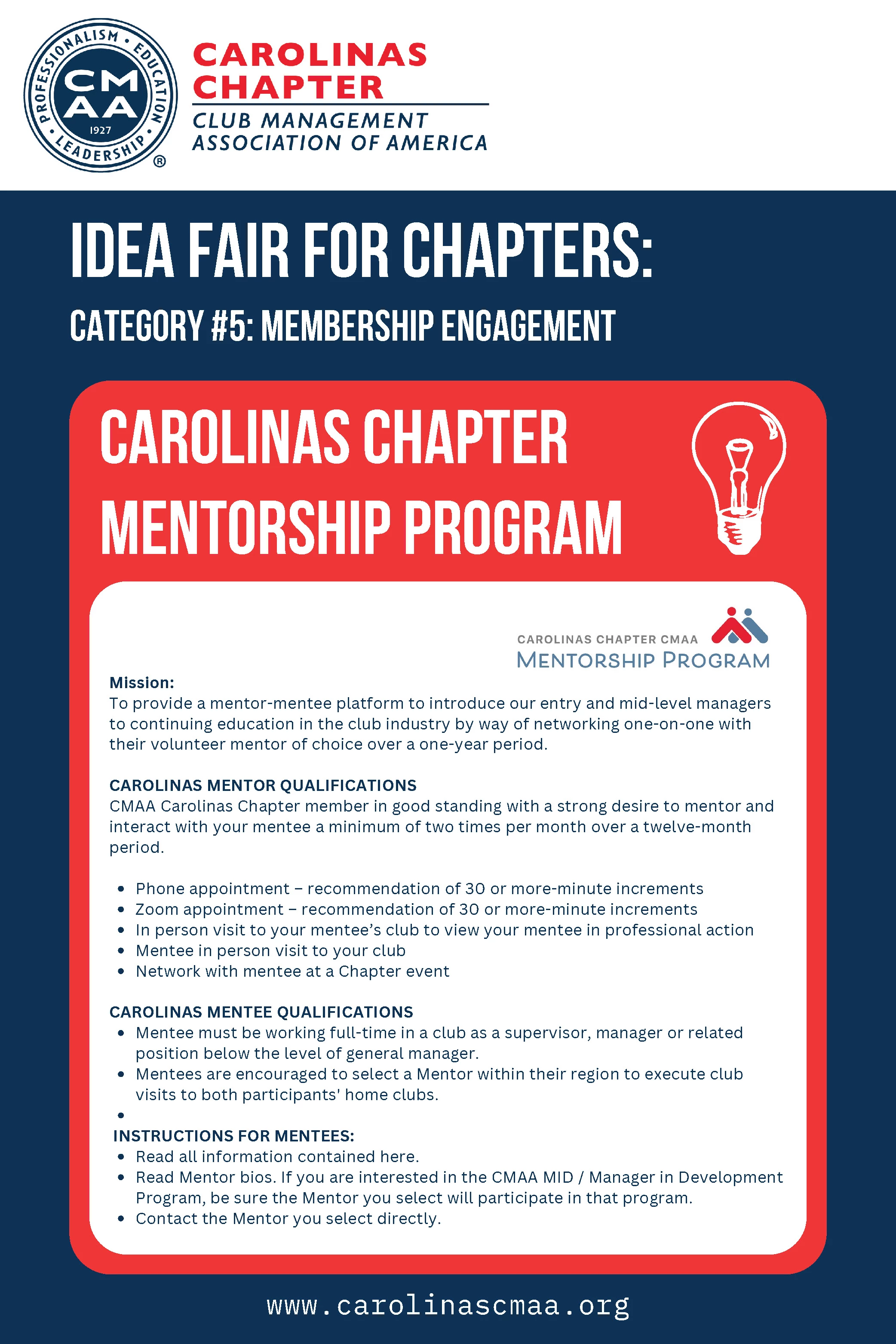CMAA Carolinas Chapter member in good standing with a strong desire to mentor and interact with your mentee a minimum of two times per month over a twelve-month period. - Phone appointment – recommendation of 30 or more-minute increments - Zoom appointment – recommendation of 30 or more-minute increments - In person visit to your mentee’s club to view your mentee in professional action - Mentee in person visit to your club - Network with mentee at a Chapter event