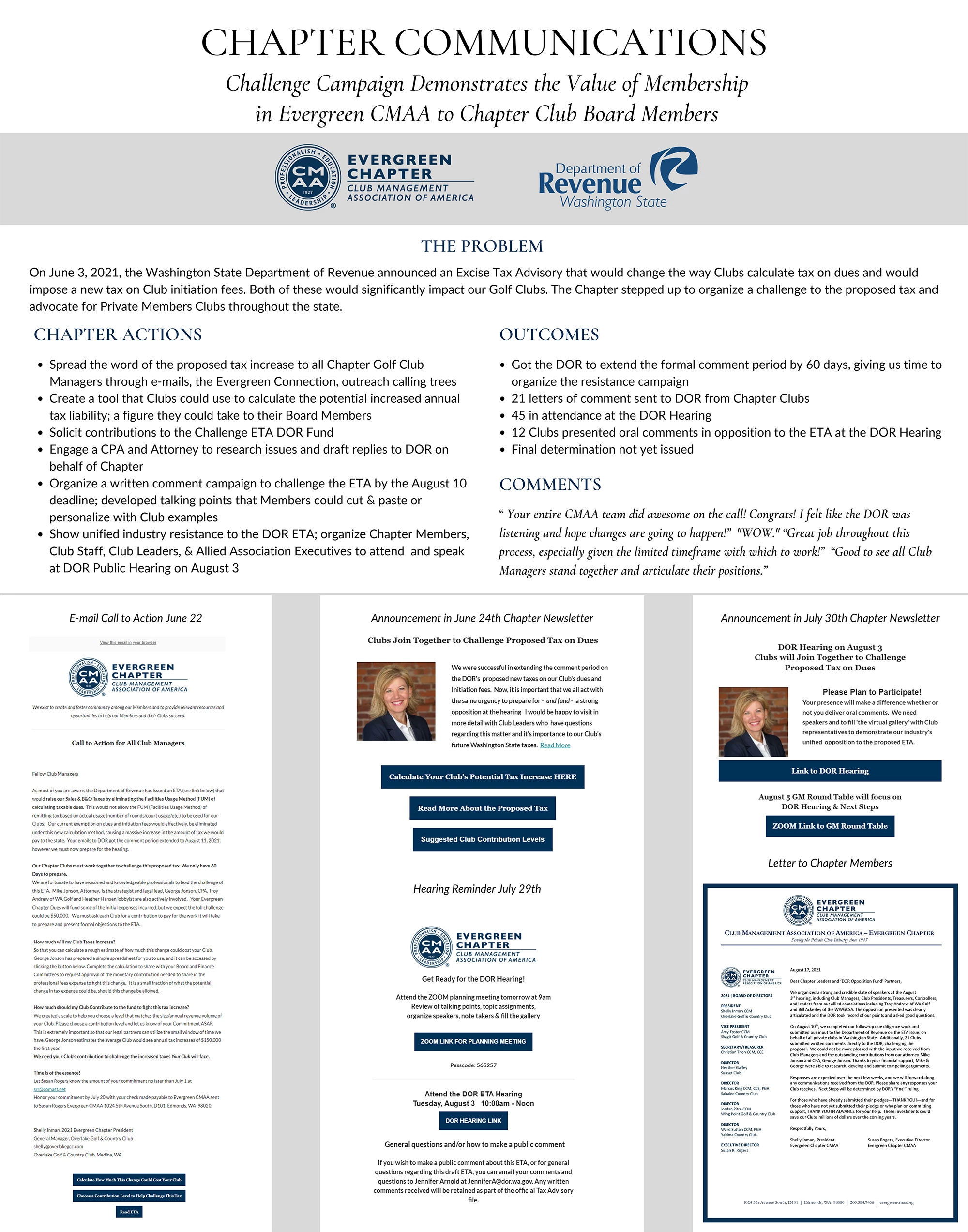 Solicited funds to support the Challenge, engaged professionals to research, develop and deliver opposition documents on Evergreen's behalf, created proposed tax increase "calculator", and cut n' paste talking points for Clubs' use in comments, filled the gallery at the DOR formal virtual hearing, presented comments from speakers, 21 Clubs sent comments to DOR. Reaction of Chapter Members - PROUD and POWERFUL, Enhanced image of Egcmaa
