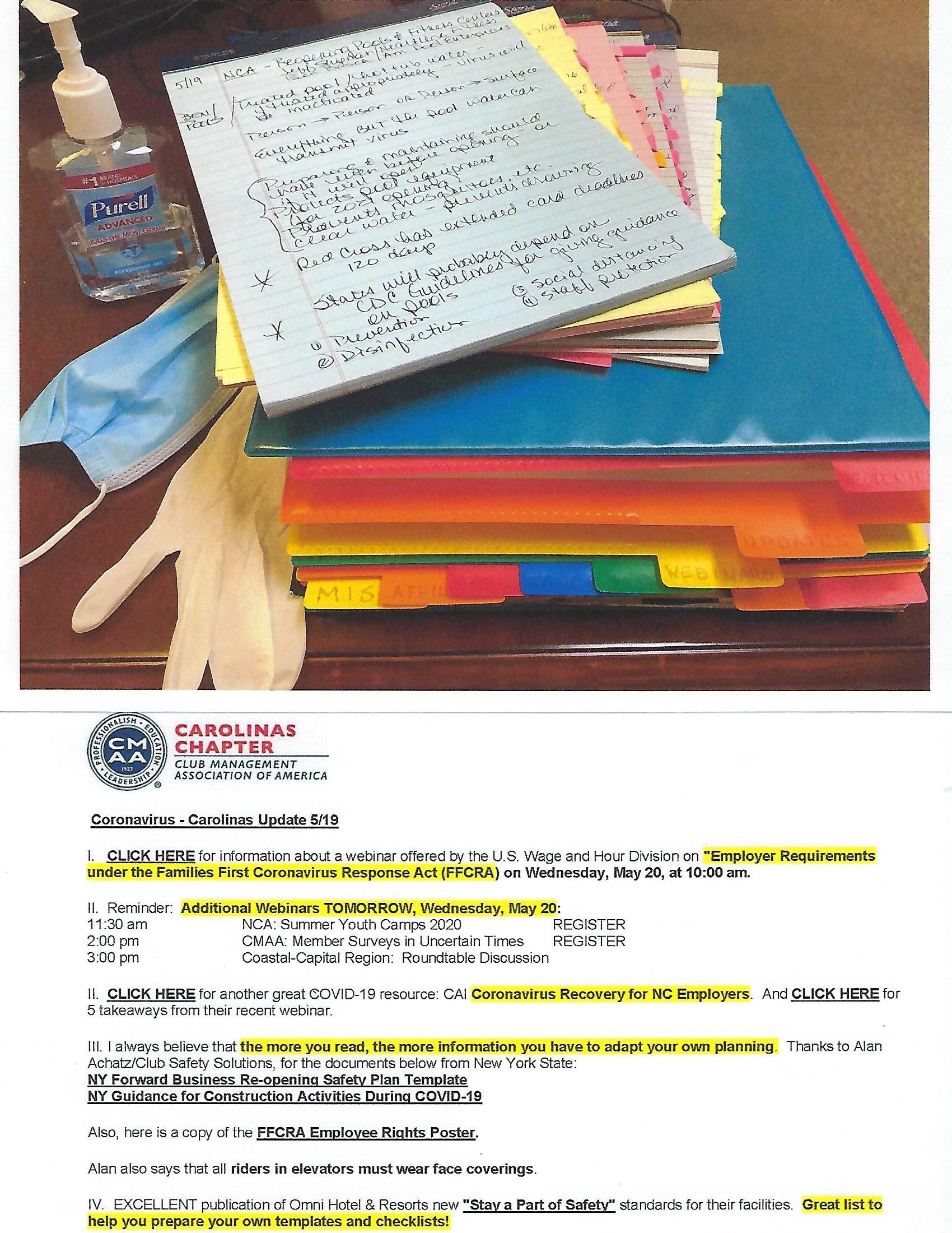 Therefore, I immediately began to research everything that could possibly affect our managers and their clubs, and I watched and took notes on every webinar available for over five months – well over 100 webinars – and communicated this information immediately to our members. [See photo: notepads full of webinar notes, a 2” binder full of information, and other daily COVID necessities] I began an eblast (“Coronavirus – Carolinas Chapter Update”) which went out at least once a day, sometimes twice. In the beginning, the rules were changing so fast and were so unclear that my goal was to let everyone know as much as I could. I also invited our member clubs to send me updates on what they were doing, letters to their members, and so on, which I shared and which were extremely helpful to other clubs.