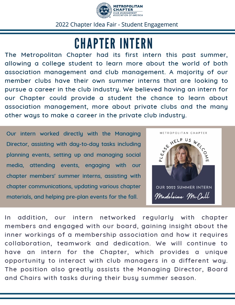 The Board wanted to create an internship for the Chapter to give a student the opportunity to learn more about the world of association management and in turn take a deeper dive and see a different side of club management. The intern worked directly with the Managing Director assisting with a large array of tasks. This was especially helpful in the summer when Board/Committee engagement is low due to demanding summer work schedules. This was a win-win for the Chapter and the student.