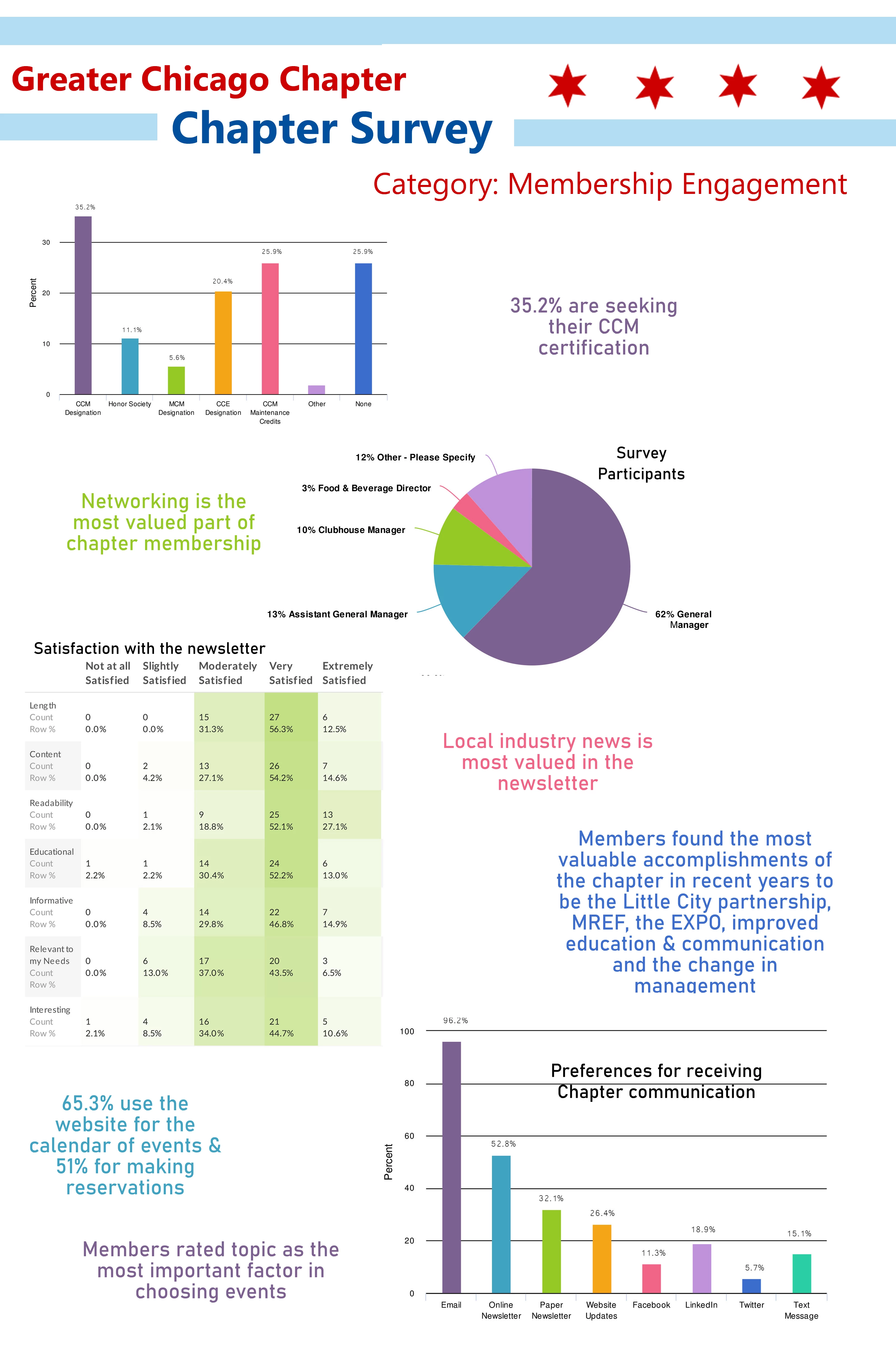 When it was time to create a new, more comprehensive strategic plan, the Chapter engaged their trusted VVP, Strategic Club Solutions. With the Boards insights, SCS created the survey questions, launched the survey and compiled the results. Member participation was excellent and yielded a plethora of verbatim comments. The Chapter members appreciated the chance to share their opinions and expectations