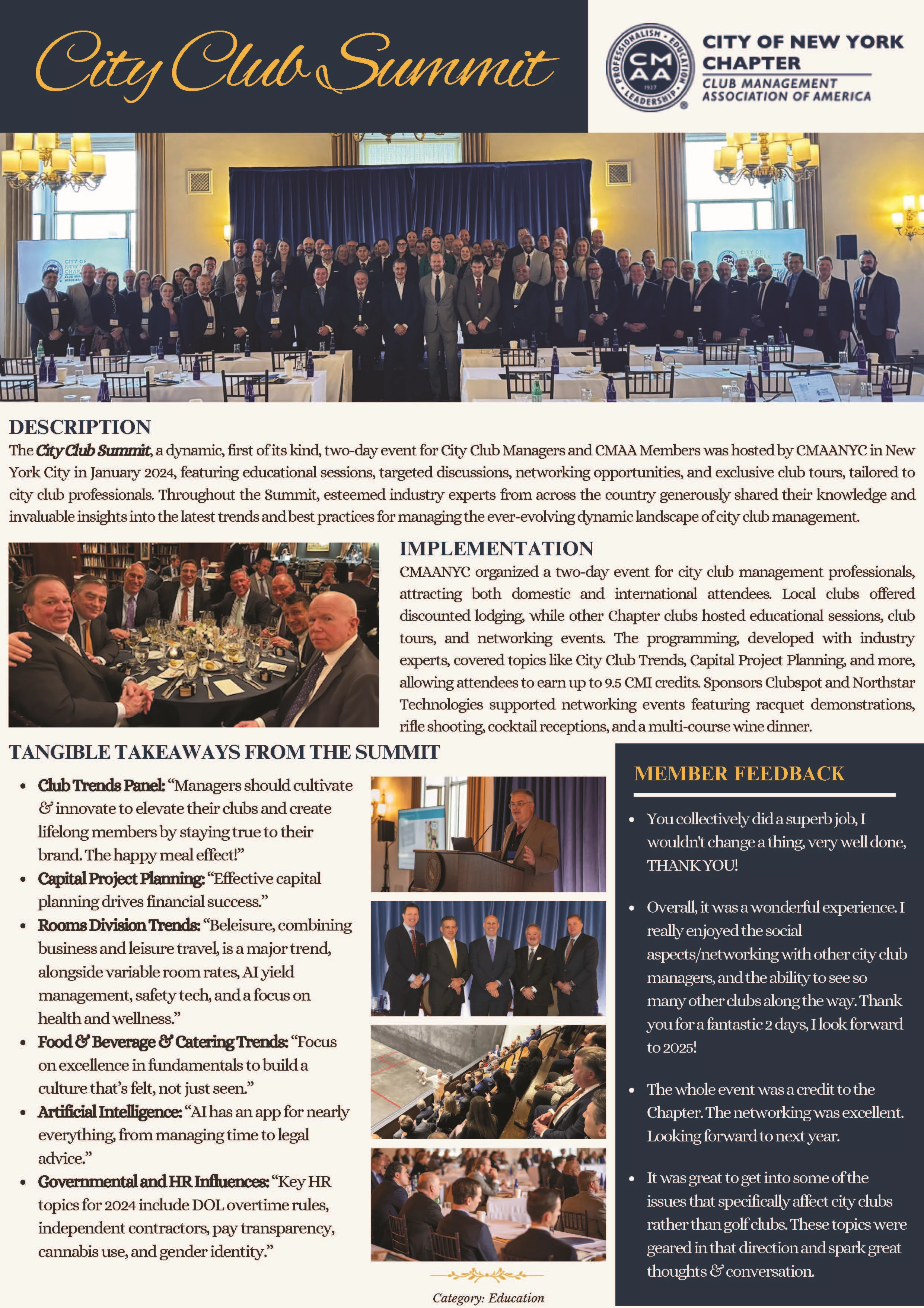 The City Club Summit, a dynamic, first of its kind, two-day event for City Club Managers and CMAA Members was hosted by CMAANYC in New York City in January 2024, featuring educational sessions, targeted discussions, networking opportunities, and exclusive club tours, tailored to city club professionals. Throughout the Summit, esteemed industry experts from across the country generously shared their knowledge and invaluable insights into the latest trends and best practices for managing the ever-evolving dynamic landscape of city club management.