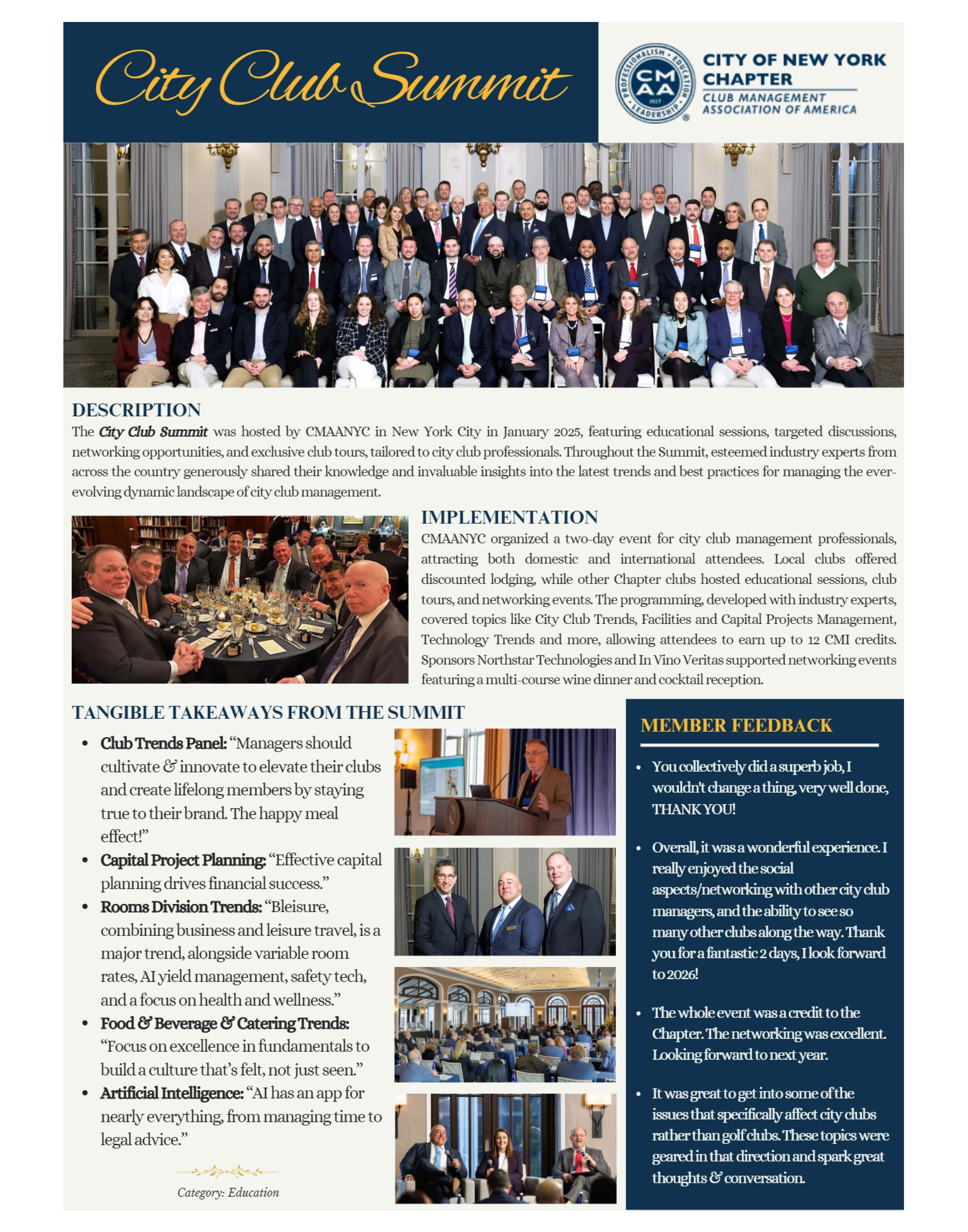 The City Club Summit enhanced our Chapter by positioning CMAANYC as an innovator and leader in city club–focused programming, expanding our educational offerings, strengthening industry partnerships, raising our national profile, and delivering direct, tangible value to our Chapter members.
