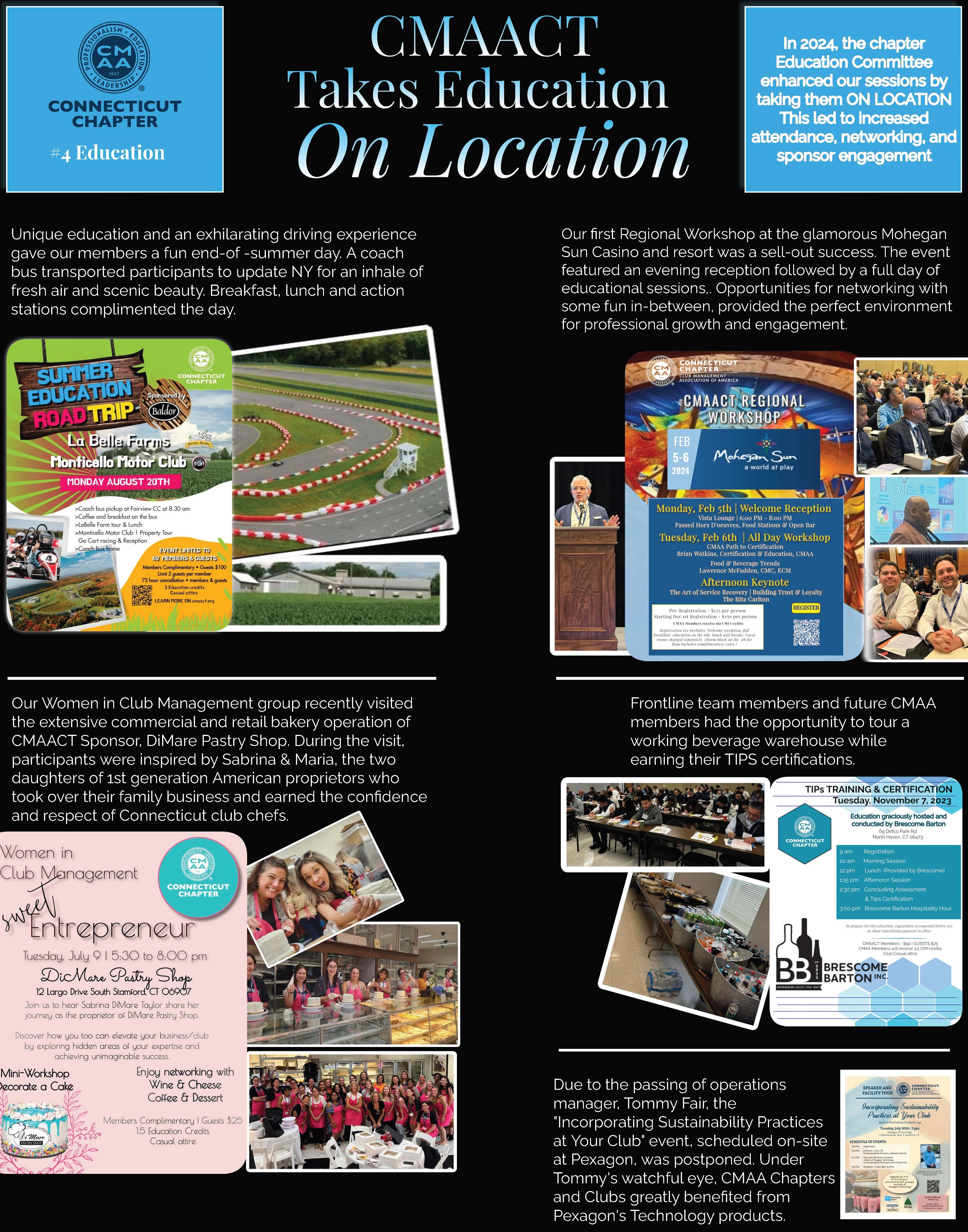 Our education committee includes six committed CMAACT members who each bring a particular interest or knowledge base to the committee. The committee comprises general managers, assistant general managers, chefs, and a controller, each bringing a unique perspective and skill set to the group. This diverse expertise has been instrumental in creating a collaborative environment where everyone's contributions have resulted in a highly successful educational year. This fusion of club professionals has contributed to our chapter's regional recognition for offering inventive and diverse educational topics at varied locations.