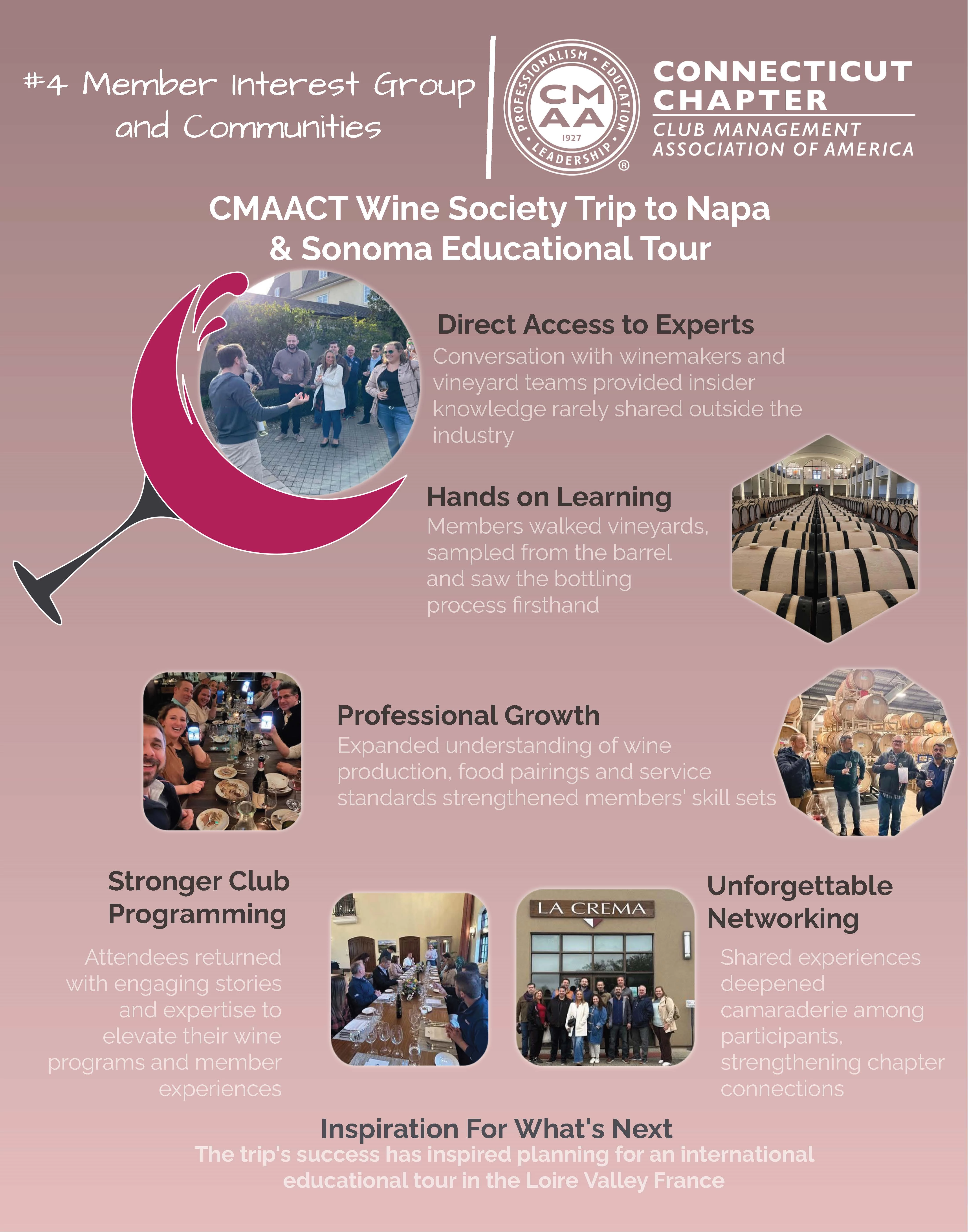 At first seeming unimaginable, our chapter's Wine Society Chair, Jeff Perez, collaborated closely with Jackson Family Wines to carefully coordinate an immersive trip for our members. Every detail—from vineyard tours and conversations with winemakers to curated food-and-wine pairings with each meal was thoughtfully planned, ensuring a smooth and truly memorable learning experience. The response from the members has been overwhelmingly positive, raising awareness of the benefits of being part of the CMAA Wine Society. Participating members called the trip one of the most impactful educational events the chapter has held, combining professional development with personal interactions with industry leaders. The success has generated momentum and enthusiasm, leading to lively discussions about expanding this model with an educational tour of the Loire Valley in France.