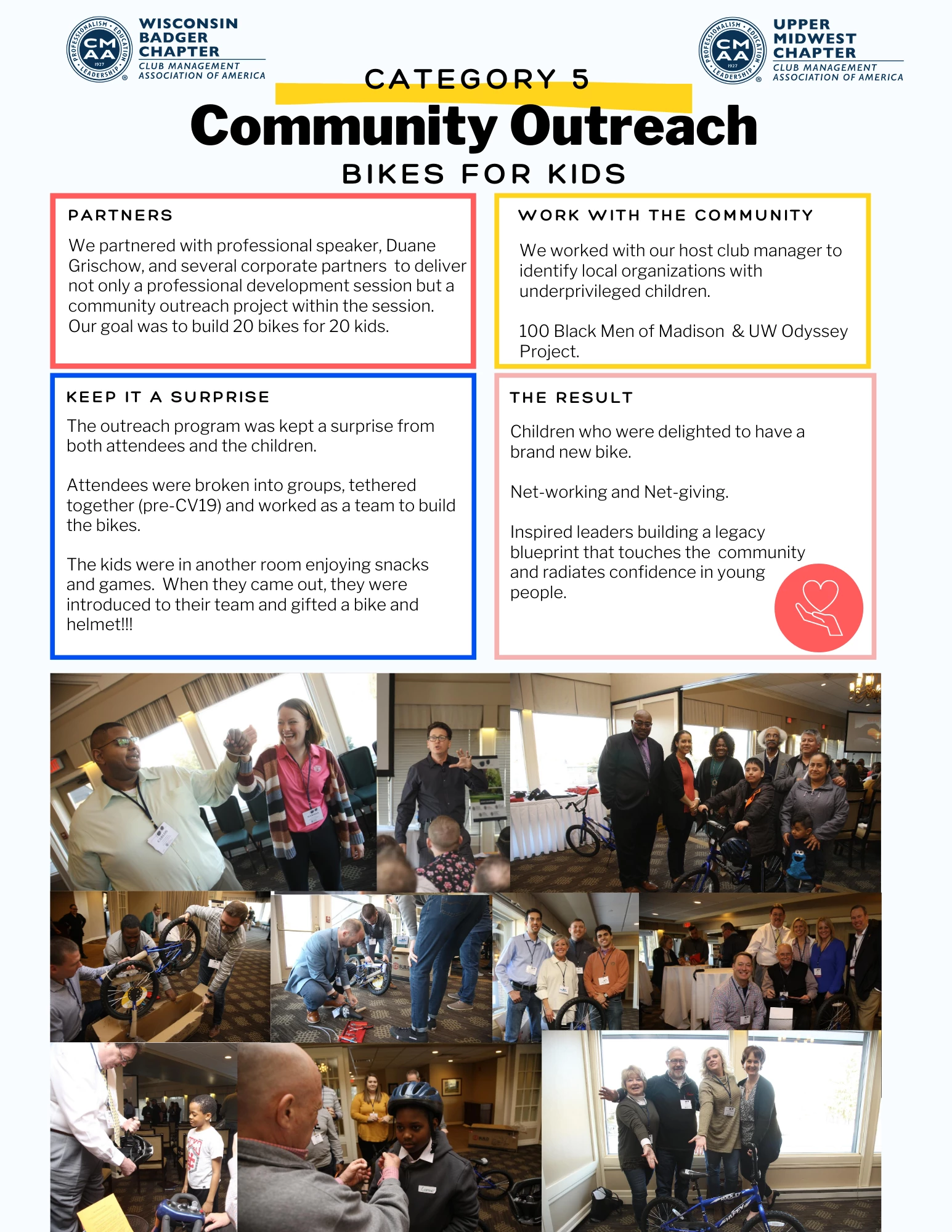 We partnered with professional speaker, Duane Grischow, and several corporate partners to deliver not only a professional development session but a community outreach project within the session. Our goal was to build 20 bikes for 20 kids.