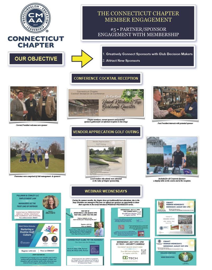 This year we added the Conference Reception at Conference. Meticulously planned, our Social Chair, President and Managing Director sent advance invitations to current sponsors, Expo Vendors Chapter Members, and friends from CMAA and Neighboring Chapters. Knowing we wanted a casual outdoor venue, close to the host hotel, we chose Union Kitchen and Tap. Nametags identified organizational affiliations. We were grateful to sign one new sponsor from this event. Most importantly, we gained new vendor/ friends, some of whom played in our Vendor Appreciation Golf Outing and whom we will again connect at next year’s conference. The Connecticut Chapter found the reception to be an important venue to learn about the wide range of business lines that will serve to round out our sponsor base. As club management is typically busy during July and August, the chapter does not usually host educations. This year, we took advantage of the virtual platform to highlight the wealth of expertise that our sponsors offer by introducing Webinar Wednesdays. Each Sponsors was given an opportunity to participate and present on a relevant educational topic in a one-hour webinar. As the weeks progressed the attendance increased and the feedback from the membership was astounding. Emails came in asking who was speaking next, and will the recordings and slides be available? Both were posted on the website for all chapter members to use and share. This opportunity for our sponsors to connect with the chapter proved successful: