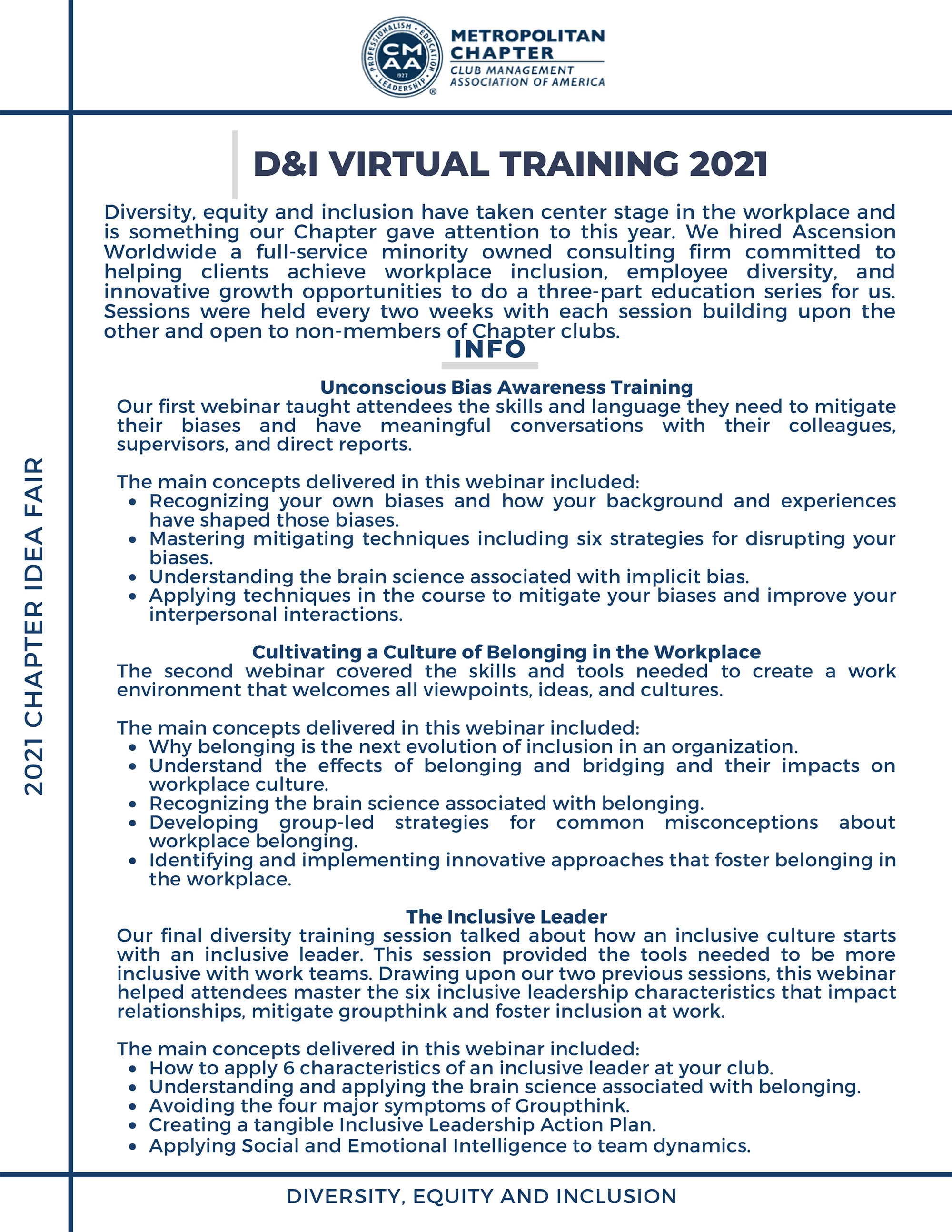 Diversity, equity and inclusion have taken center stage in the workplace and is something our Chapter gave attention to for the first time his year. We hired a consulting firm to do a three part webinar series that built upon each other to introduce, understand and make actionable changes in ones personal and professional life with regard to diversity, equity and inclusion.