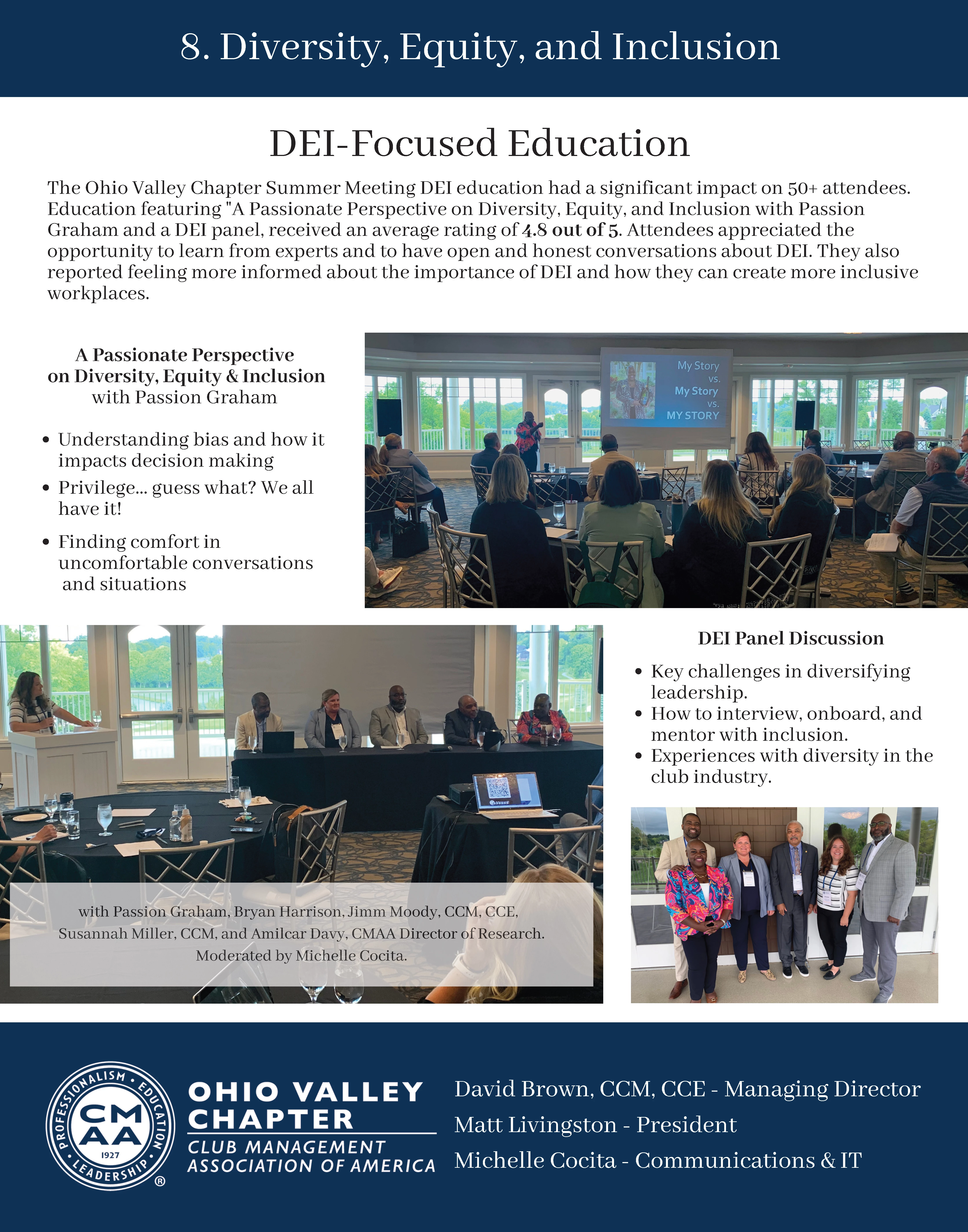 The Ohio Valley Chapter Summer Meeting DEI education had a significant impact on 50+ attendees. Education featuring "A Passionate Perspective on Diversity, Equity, and Inclusion with Passion Graham and a DEI panel, received an average rating of 4.8 out of 5.