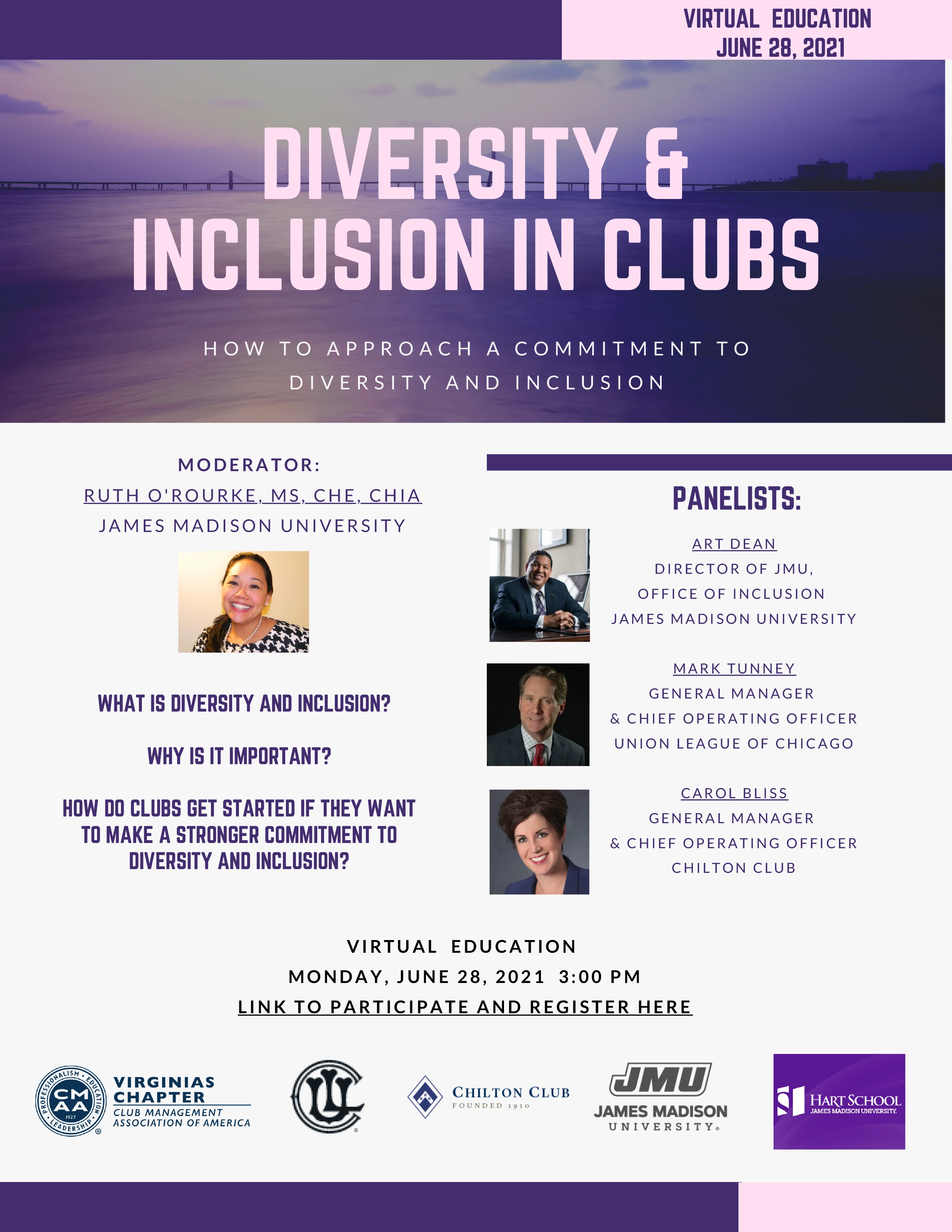 A dynamic virtual educational session was held, moderated by Ruth O'Rouke of James Madison University and featured panelists included ART DEAN DIRECTOR OF JMU ,OFFICE OF INCLUSION, JAMES MADISON UNIVERSITY, MARK TUNNEY, GENERAL MANAGER & CHIEF OPERATING OFFICER, UNION LEAGUE OF CHICAGO, CAROL BLISS, GENERAL MANAGER & CHIEF OPERATING OFFICER CHILTON CLUB. This was a very welcomed session and is continued to be shared. It was a great start.