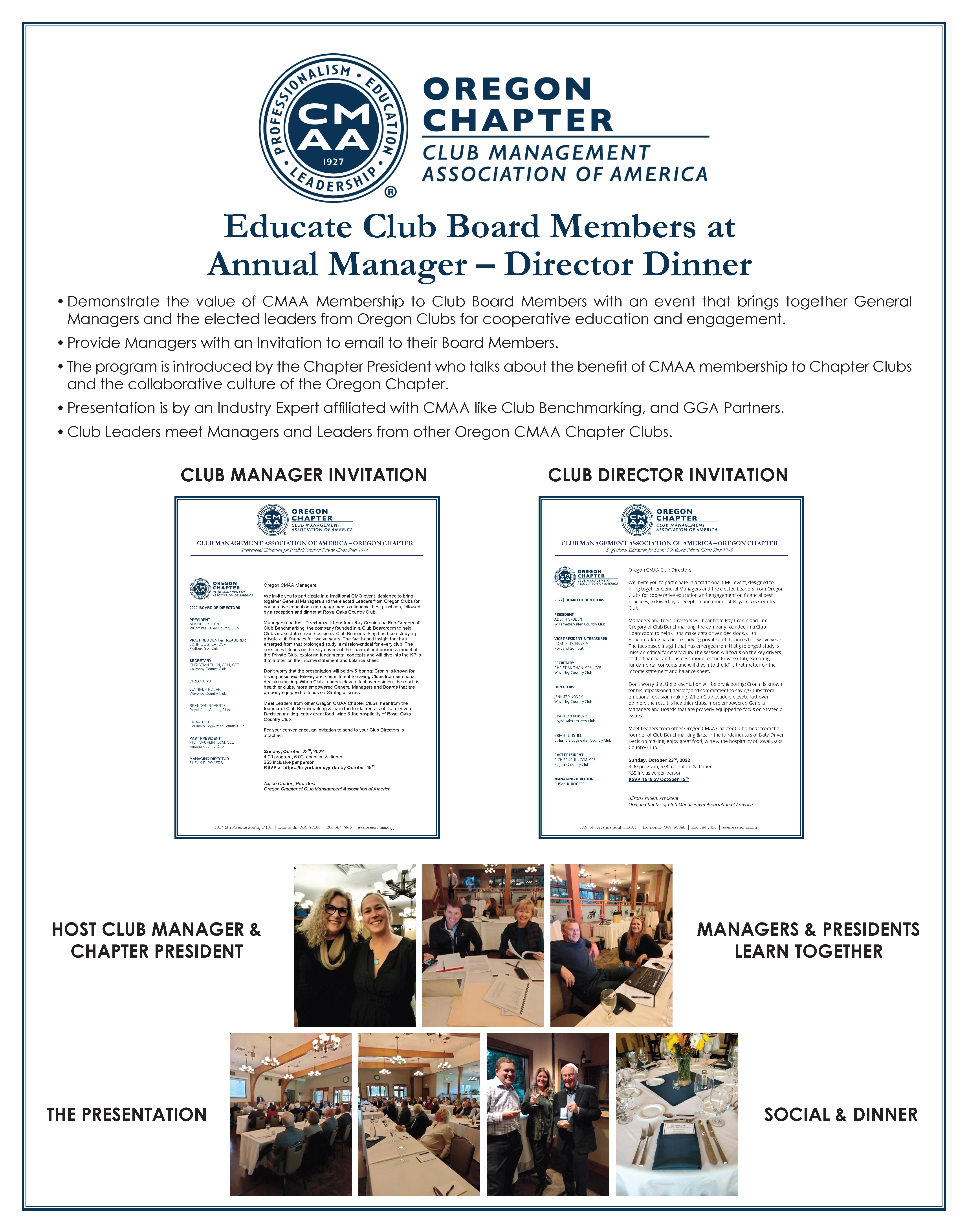 We demonstrate the value of CMAA Membership to Club Board Members with an event that brings together General Managers and the elected leaders from Oregon Clubs for cooperative education and engagement. GM's and their Club leaders hear from an industry expert on matters that directly impact their Club, then have an opportunity to connect with leaders from other Chapter Club over cocktails and dinner.