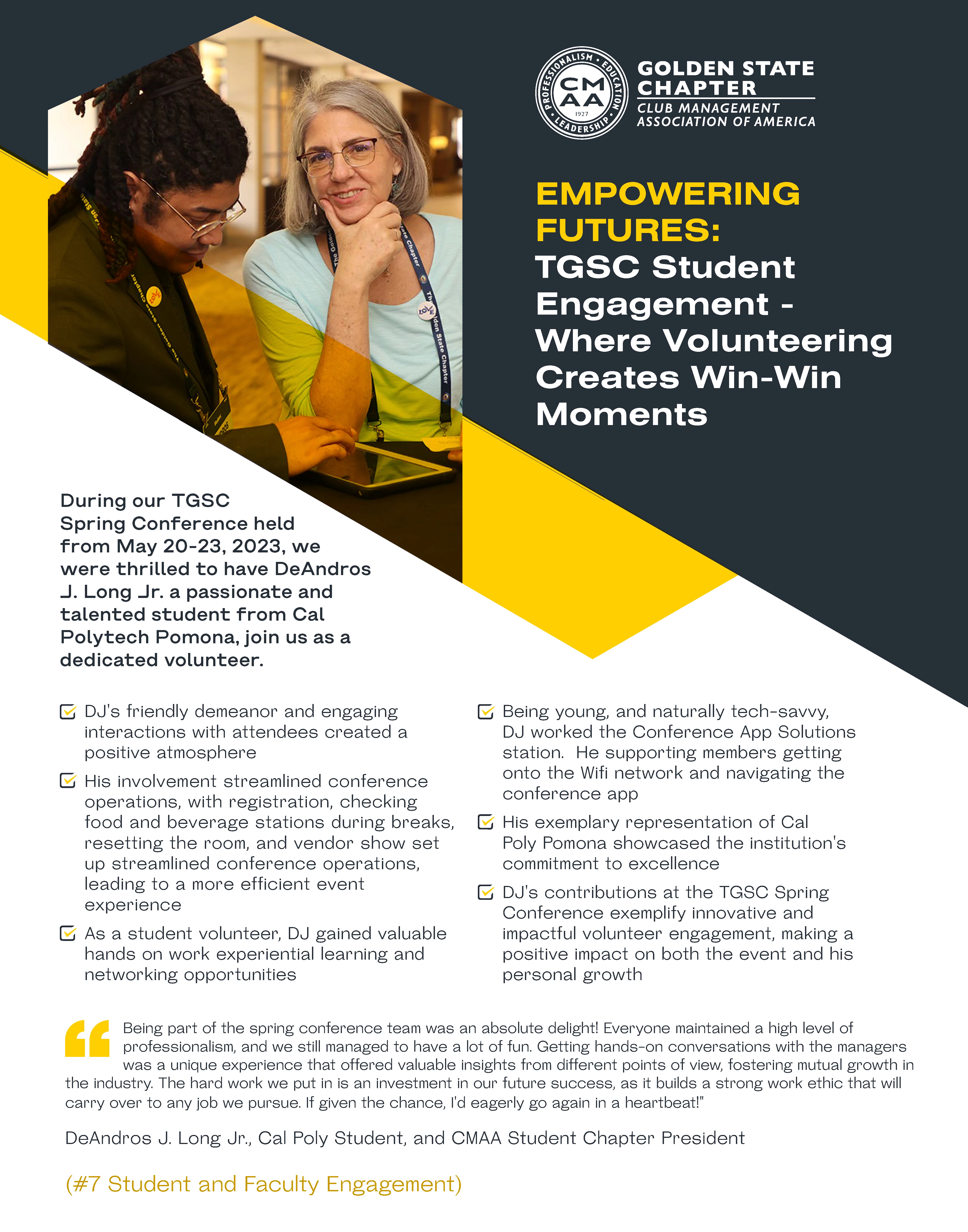 The idea was easily implemented after conversations with DJ. By having DJ volunteer during the TGSC Spring Conference and join us for pre-conference set up, the two and a half days of the conference, and post-conference cleanup and debrief, he supported Crystal Thomas, MCM, CHE, CAE, TGSC’s Managing Director, and her team. The general reaction of TGSC members has been highly positive, with DJ's contributions praised for enhancing the event's success, attendee experience, and overall sense of community.
