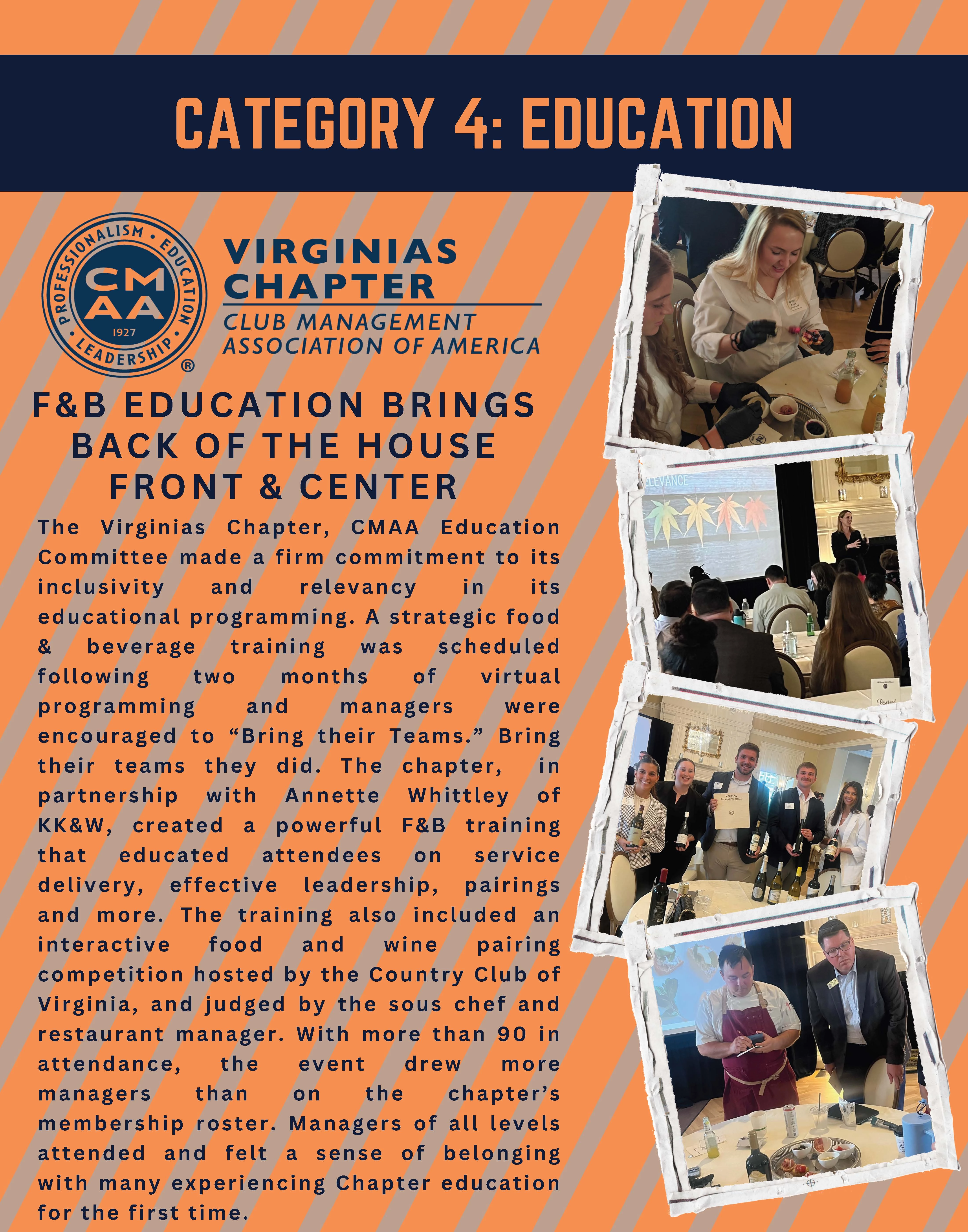 Through planning, the Virginias Chapter Board and Education Committee sought to implement a strong food and beverage component to its education calendar and offering. The Chapter, in an effort to boost attendance and reach, curtailed the programming to include a pairings challenge and contest for team members. Managers supported the event by sending many of their back of the house personnel. The event was a huge success and has created momentum for the Chapter. It was fun, innovative and brought all club outlets together.